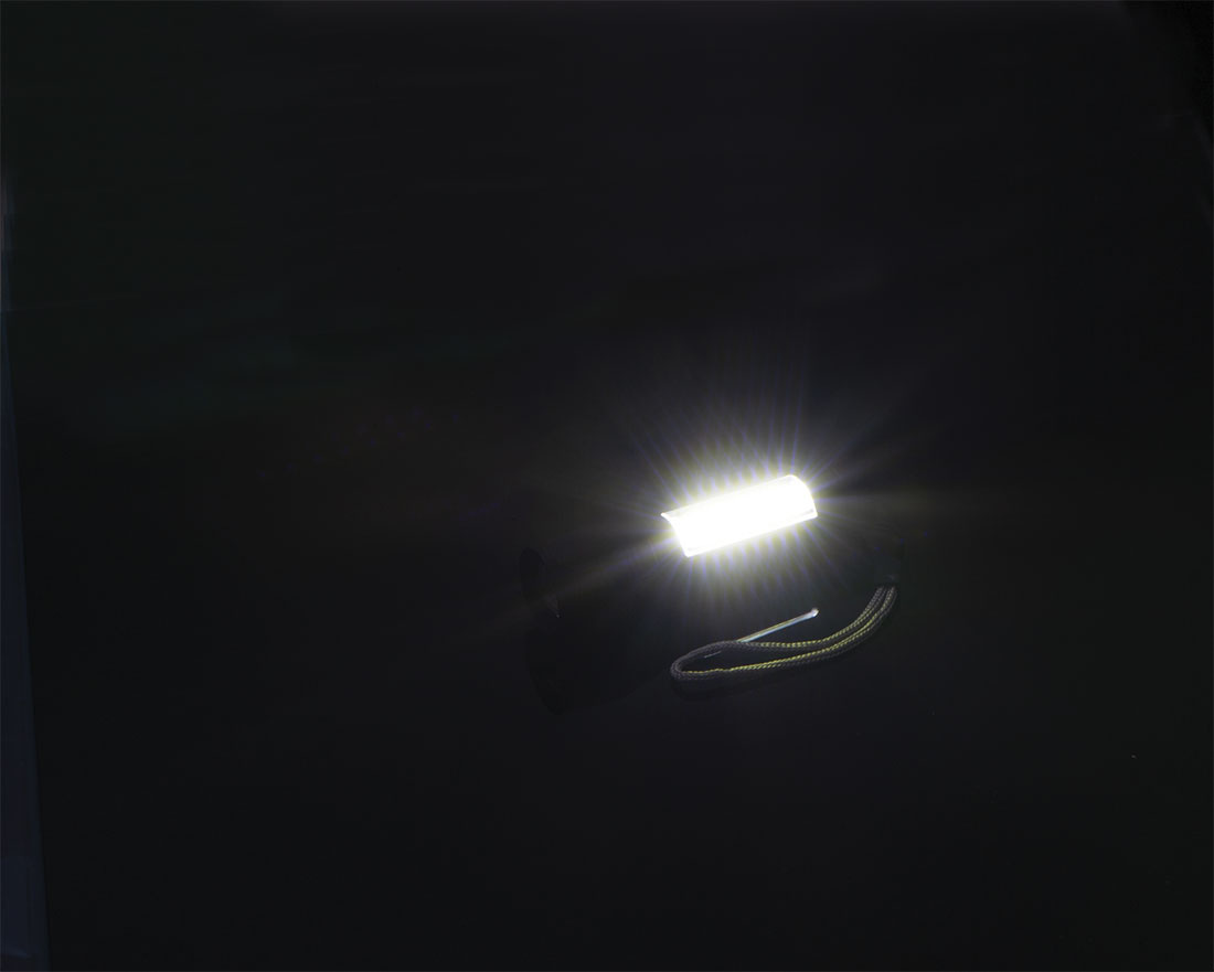 Wiederaufladbare Taschenlampe aus Aluminium (400 mAh) in einer schwarzen Box, inklusive USB-C-Ladekabel. Die Taschenlampe verfügt über ein COB-Licht mit einstellbarem Strahl und ein COB-Licht am Schaft. Ihr Logo wird in der Mitte des Boxdeckels gedruckt.