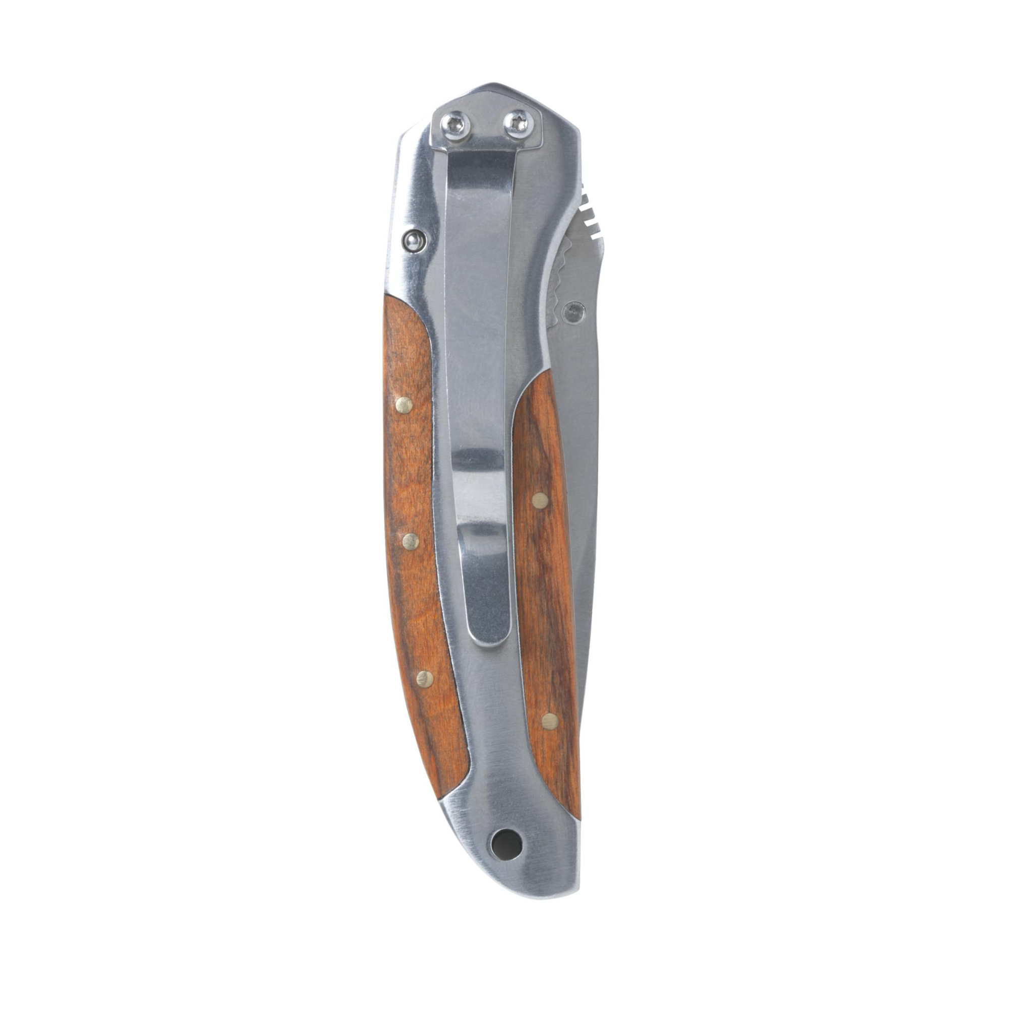 Robustes Survivalmesser aus rostfreiem Stahl mit gezackter Klinge, Holzeinlage im Griff und praktischem Clip. Bitte beachten Sie, dass möglicherweise lokale Vorschriften für den Besitz und/oder das Tragen von Messern oder Multitools in der Öffentlichkeit gelten. Jeder Artikel wird in einer einzelnen braunen Kartonschachtel geliefert.