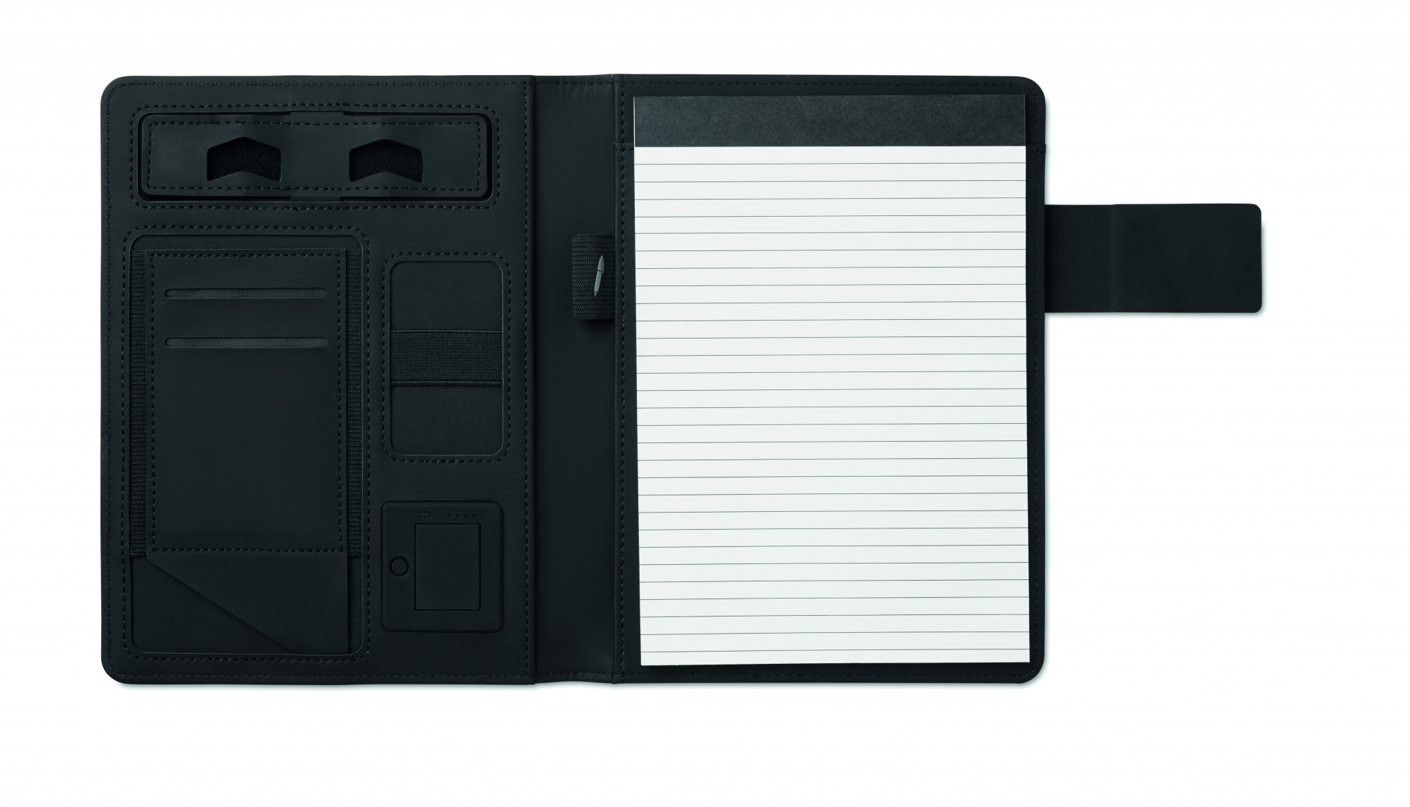 DIN A5 Portfolio mit Cover aus PU in Leinen-Optik. Magnetverschluss. Block mit 20 Blatt (40 Seiten) liniertem Papier. Inkl. 4000 mAh Powerbank und Mikro-USB-Kabel/Typ C. Smartphone- /Tablet Halterung. Kreditkarten Steckfächer. Stiftschlaufe.
