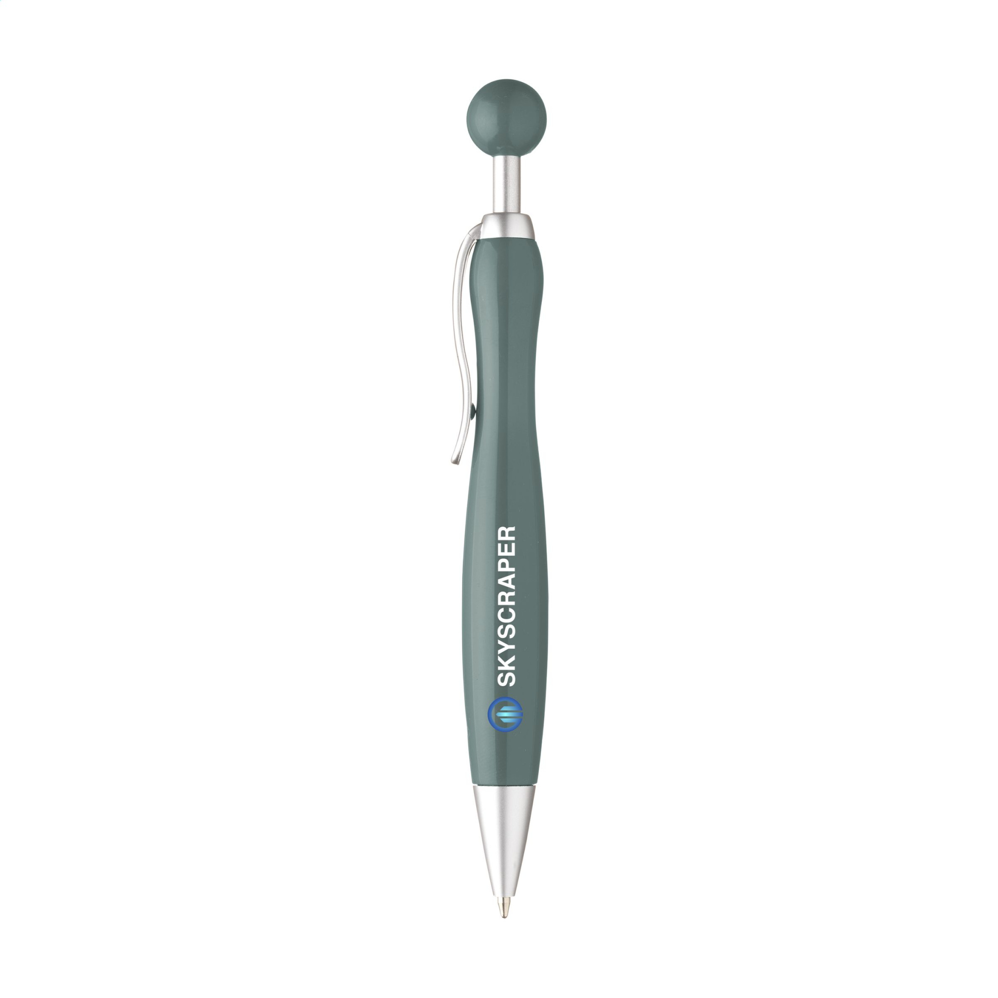 Blauschreibender Kugelschreiber mit kugelförmigem Druckknopf.
