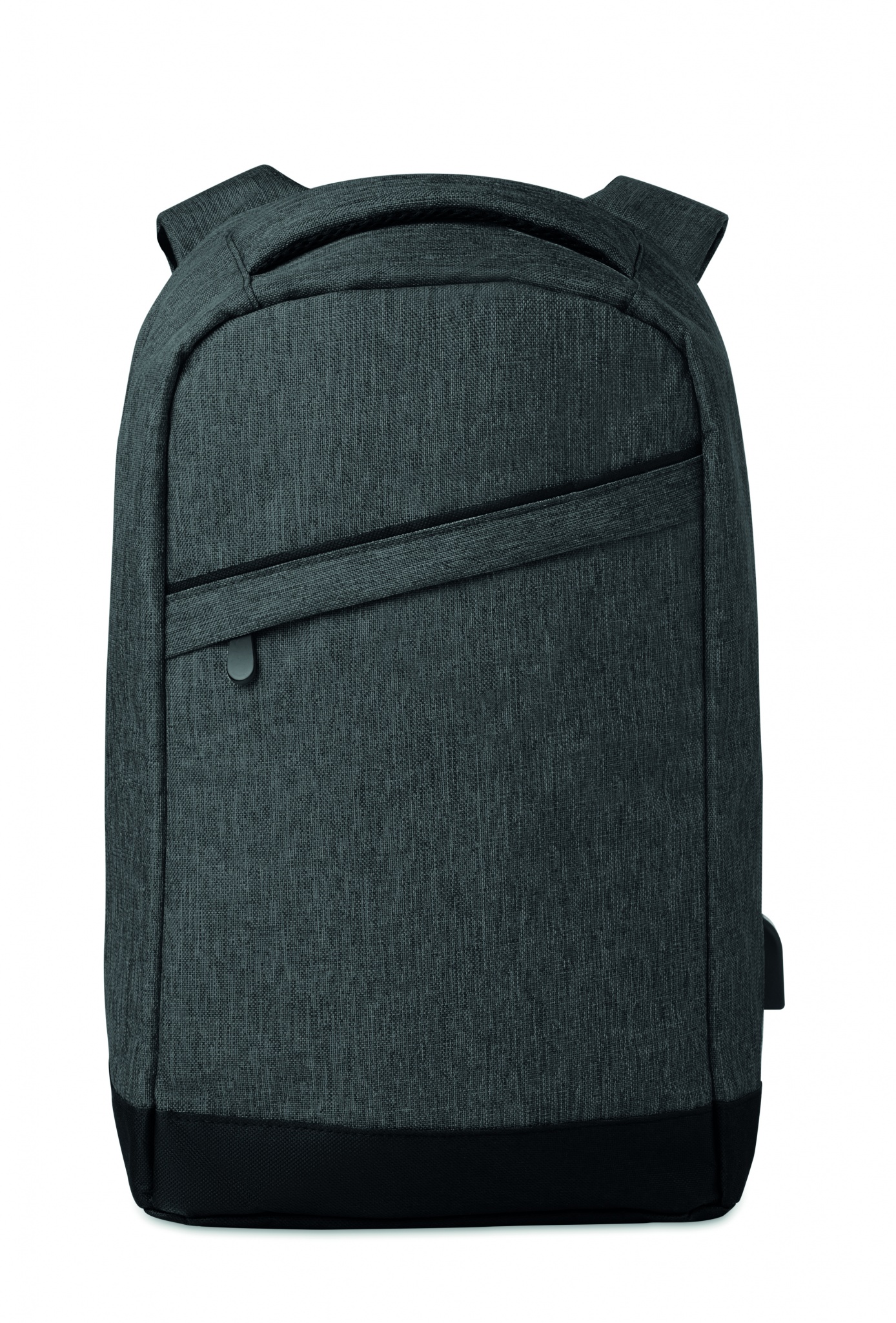 Rucksack mit großem Hauptfach. Inkl. 13 Inch Laptopfach und USB- Ladekabel. Rückseitiges Innenfach mit Reißverschluss für optimalen Schutz. Gepolsterte Schultergurte. 600D 2farbiger Polyester.
