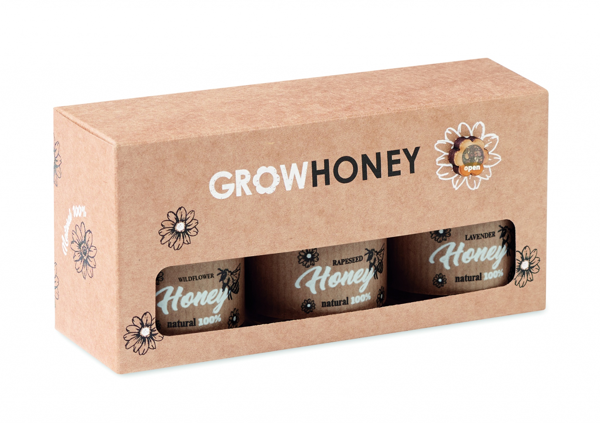 Set mit 3 unterschiedlichen Honigsorten im Glas: Wildblumen-, Lavendel- und Rapshonig (je 50 g). Inkl. Honiglöffel aus Holz und Honigblumen-Samen. Verpackt in einer Schachtel aus Kraftpapier. Hergestellt in der EU.