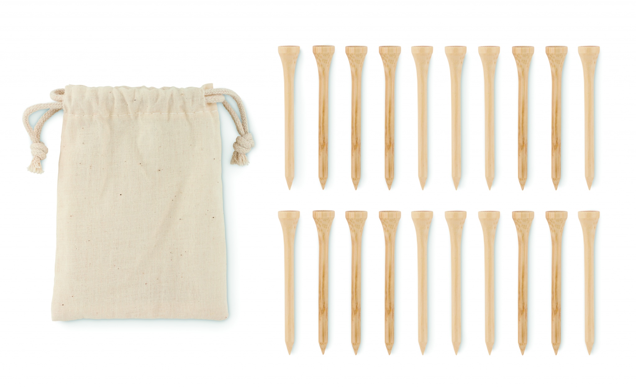 Golf tees in bamboo presented in organic cotton drawstring bag. Bamboo is a natural product, there may be slight variations in colour and size per item, which can affect the final decoration outcome.