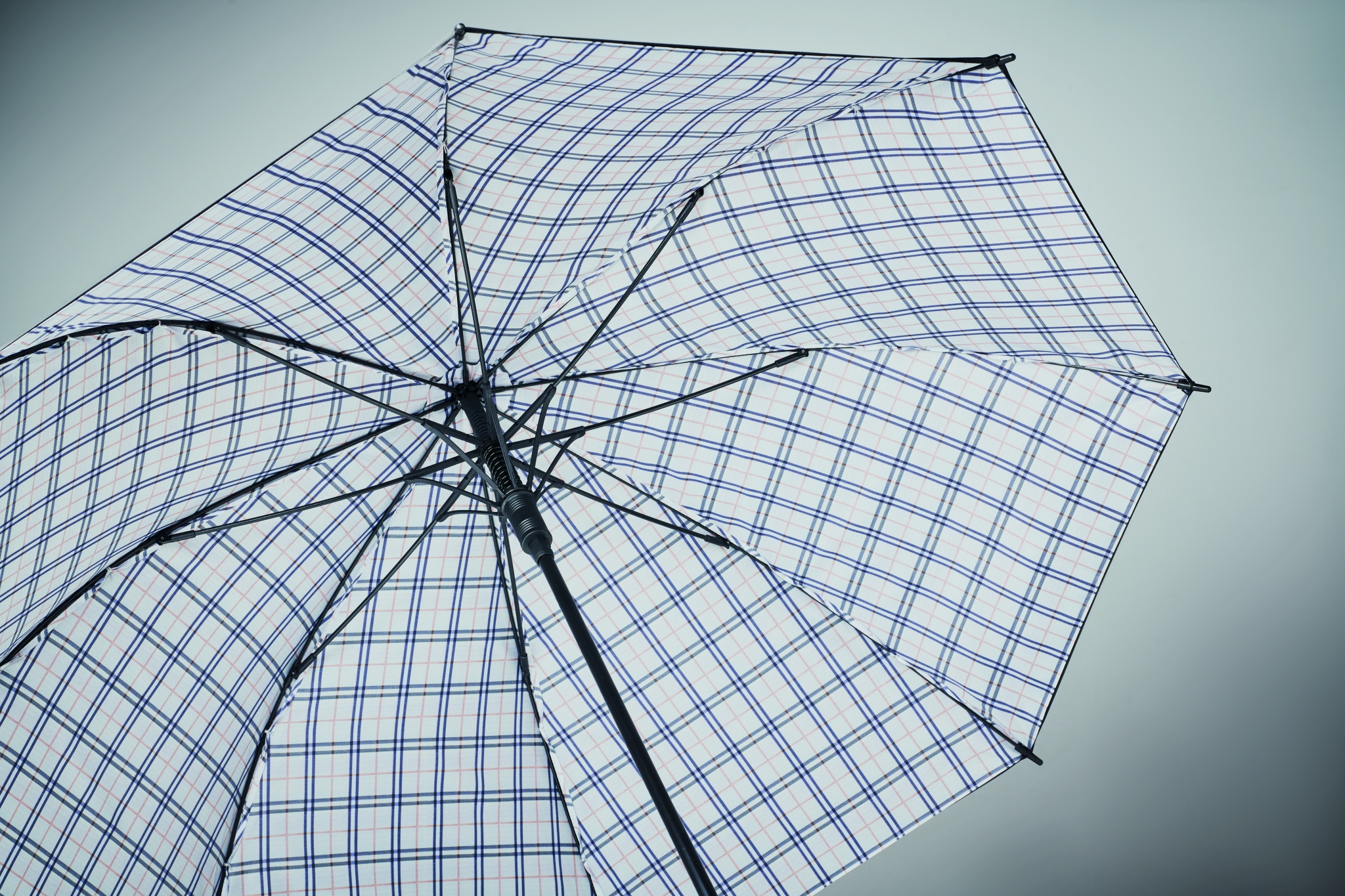 23 inch auto open windproof umbrella in 190T pongee with chequered inside pattern. Fibreglass frame with black plated shaft and plastic tips. Curved rubber finished handle. Manual closure.