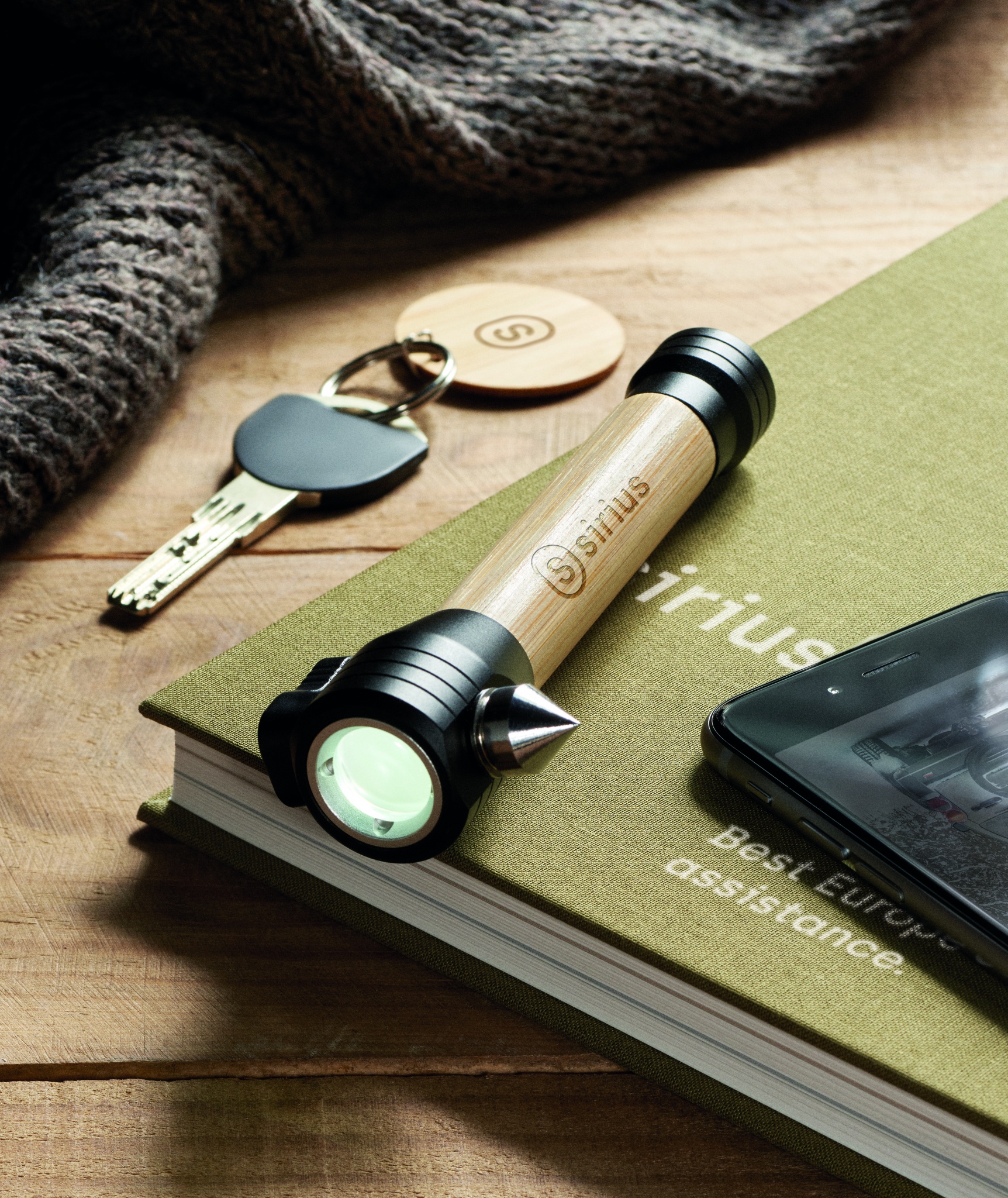Products All products 3-in-1 bamboo flashlight with an emergency hammer and seatbelt cutter