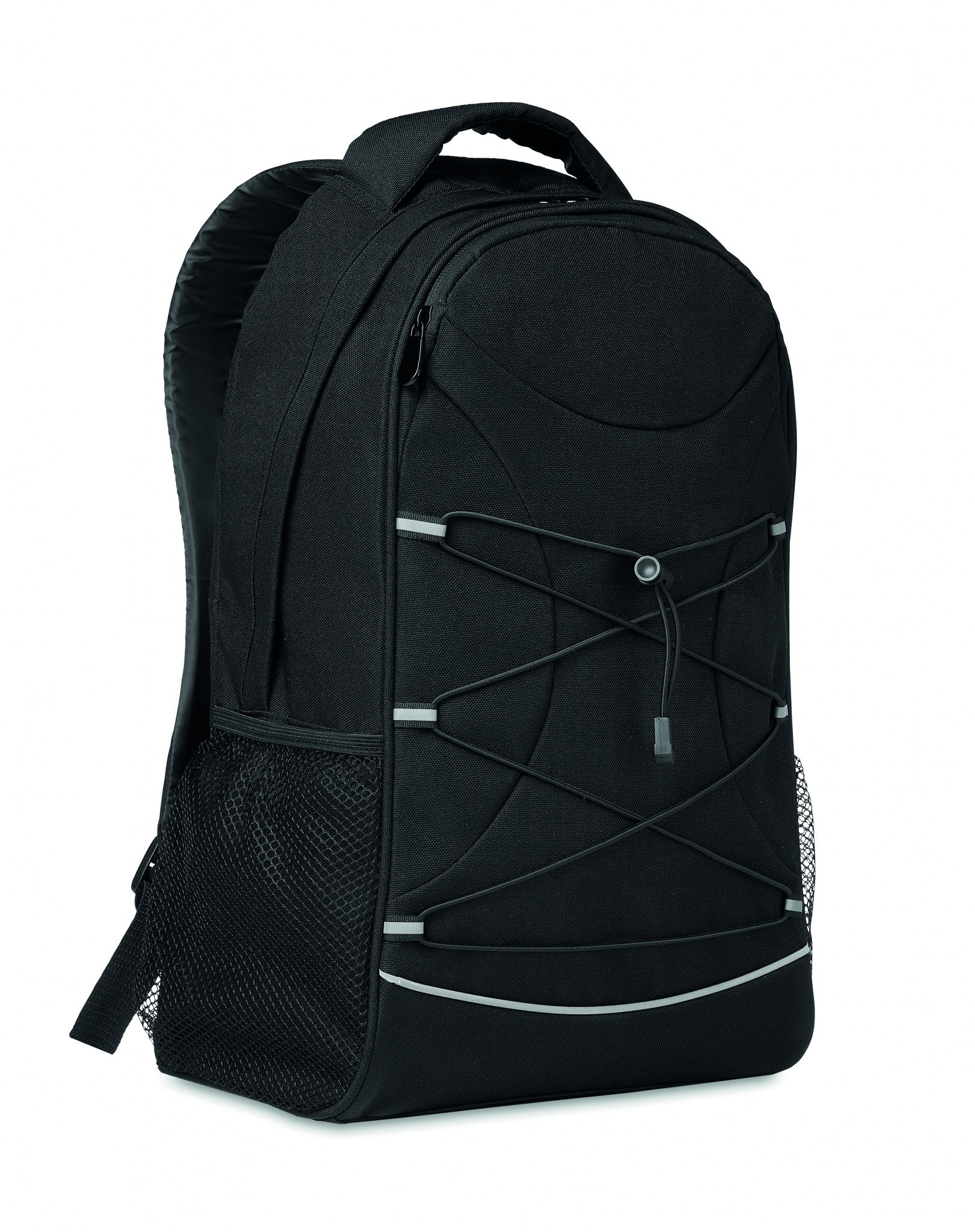 Backpack in 600D RPET with dark cords in front and reflective front panel feature. Mesh pockets on both sides.