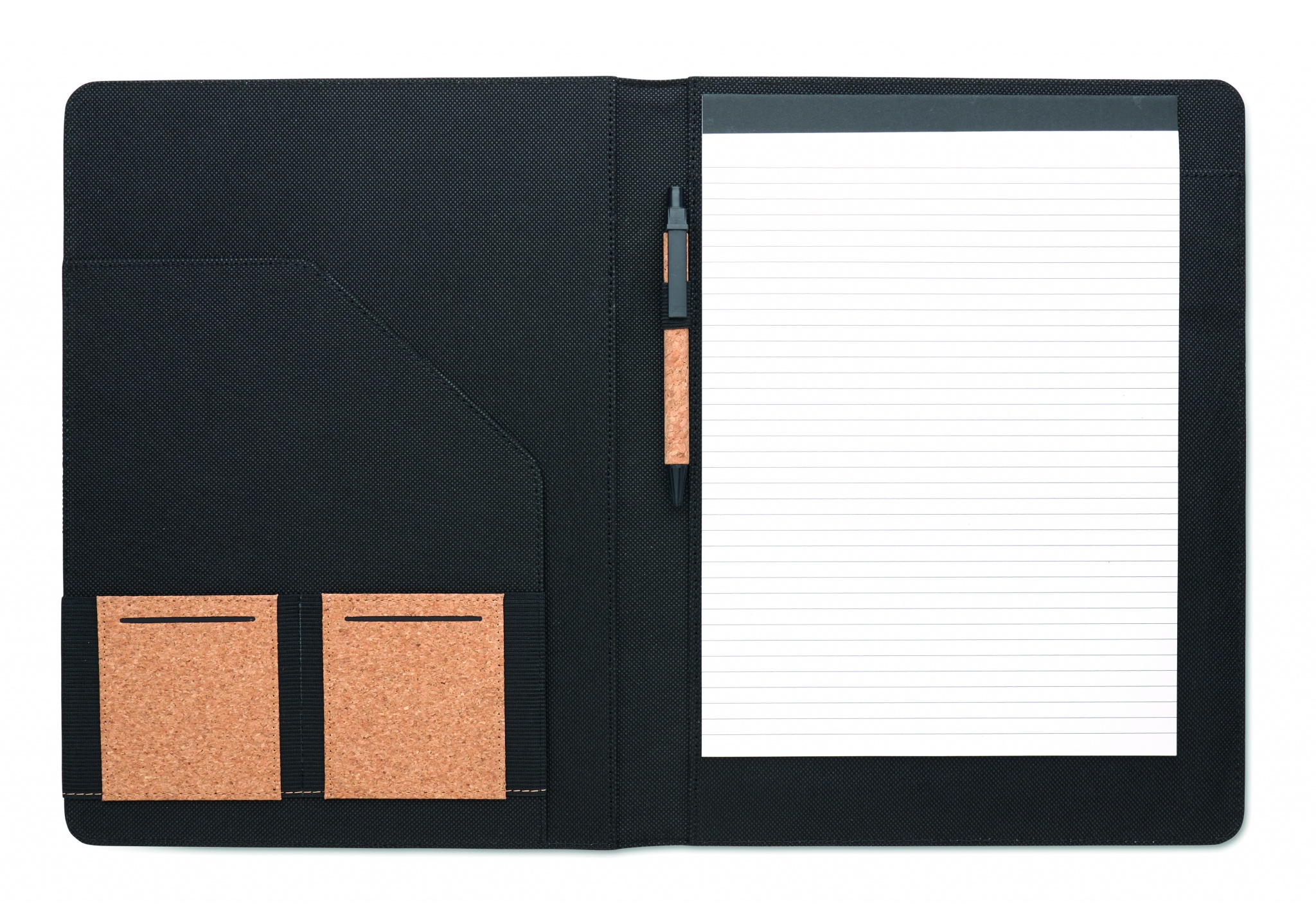 A4 cork conference folder. Refillable A4 notepad. 30 recycled paper lined sheets. Matching pen and pen holder. 2 card holders and one large compartment.