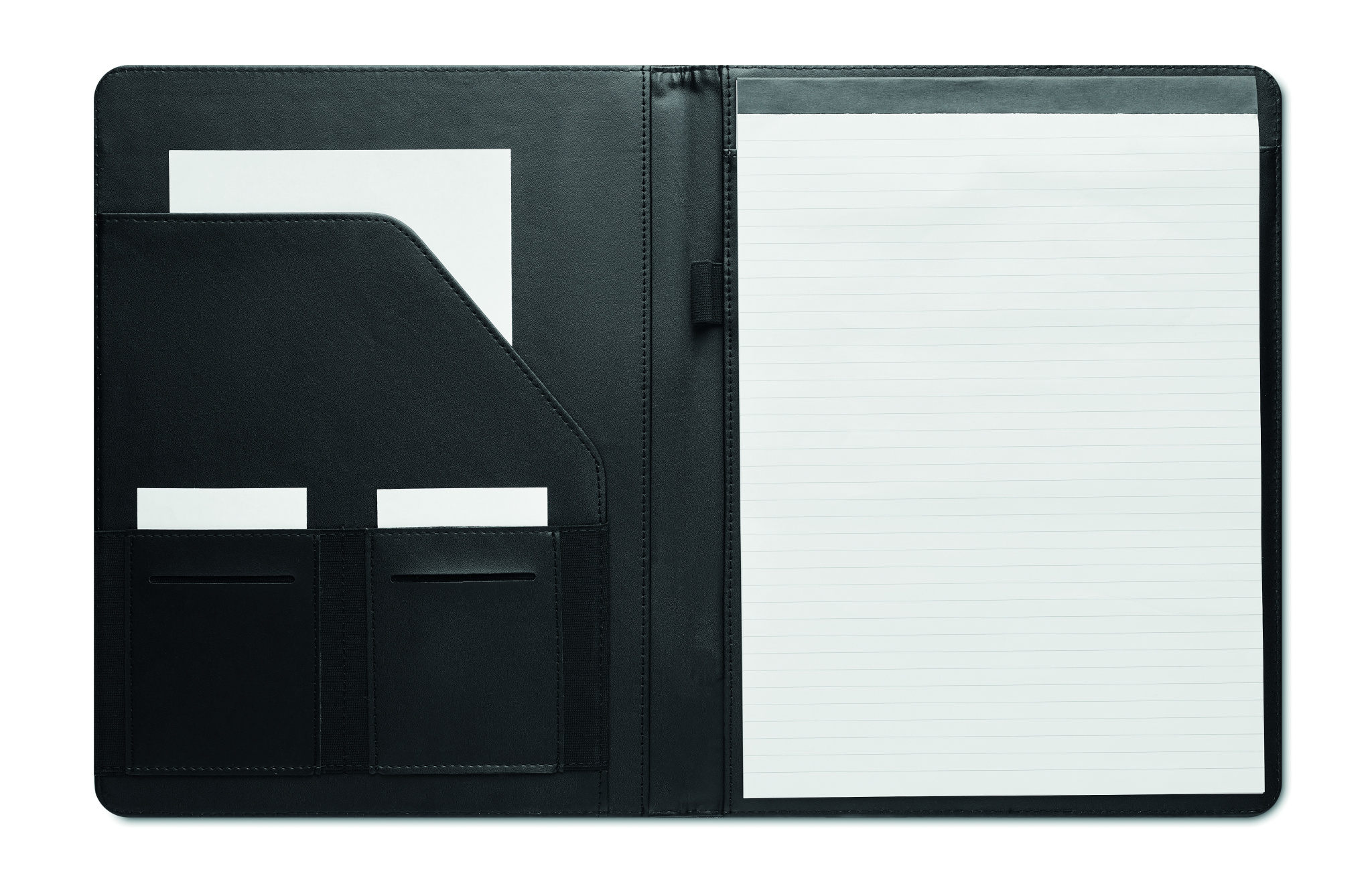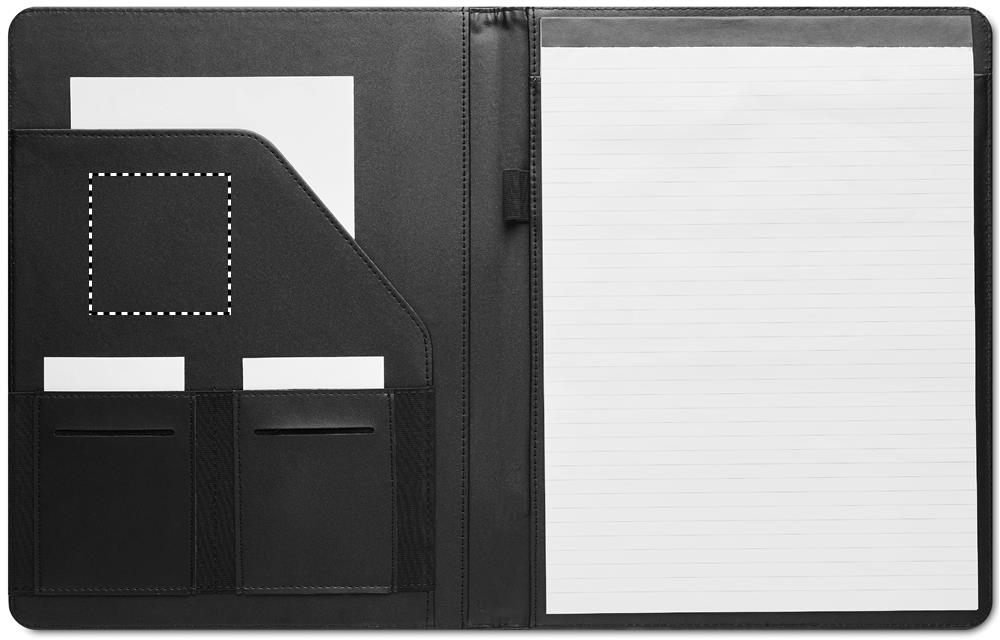 A4 conference folder with RPET cover. 20 lined bamboo paper sheets notepad. Shaped inner pocket. 2 card holders. Pen holder. Bamboo is a natural product, there may be slight variations in colour and size per item, which can affect the final decoration outcome.
