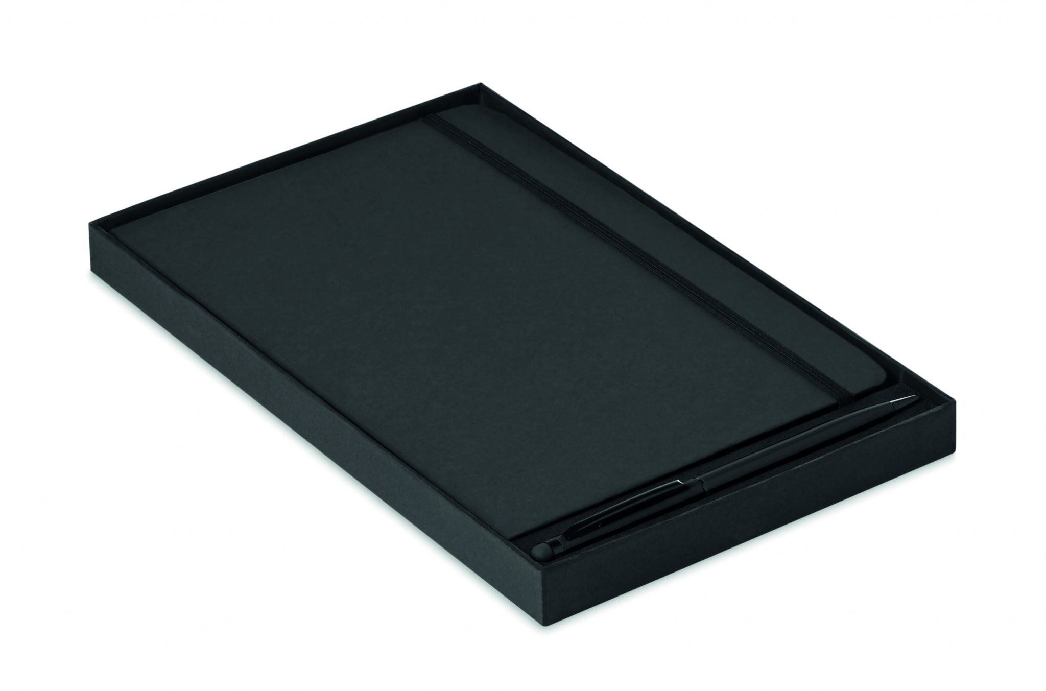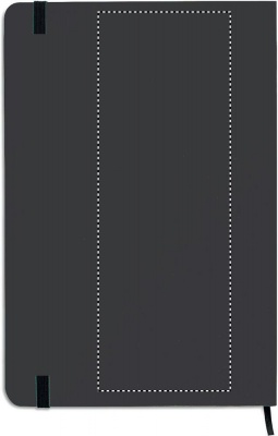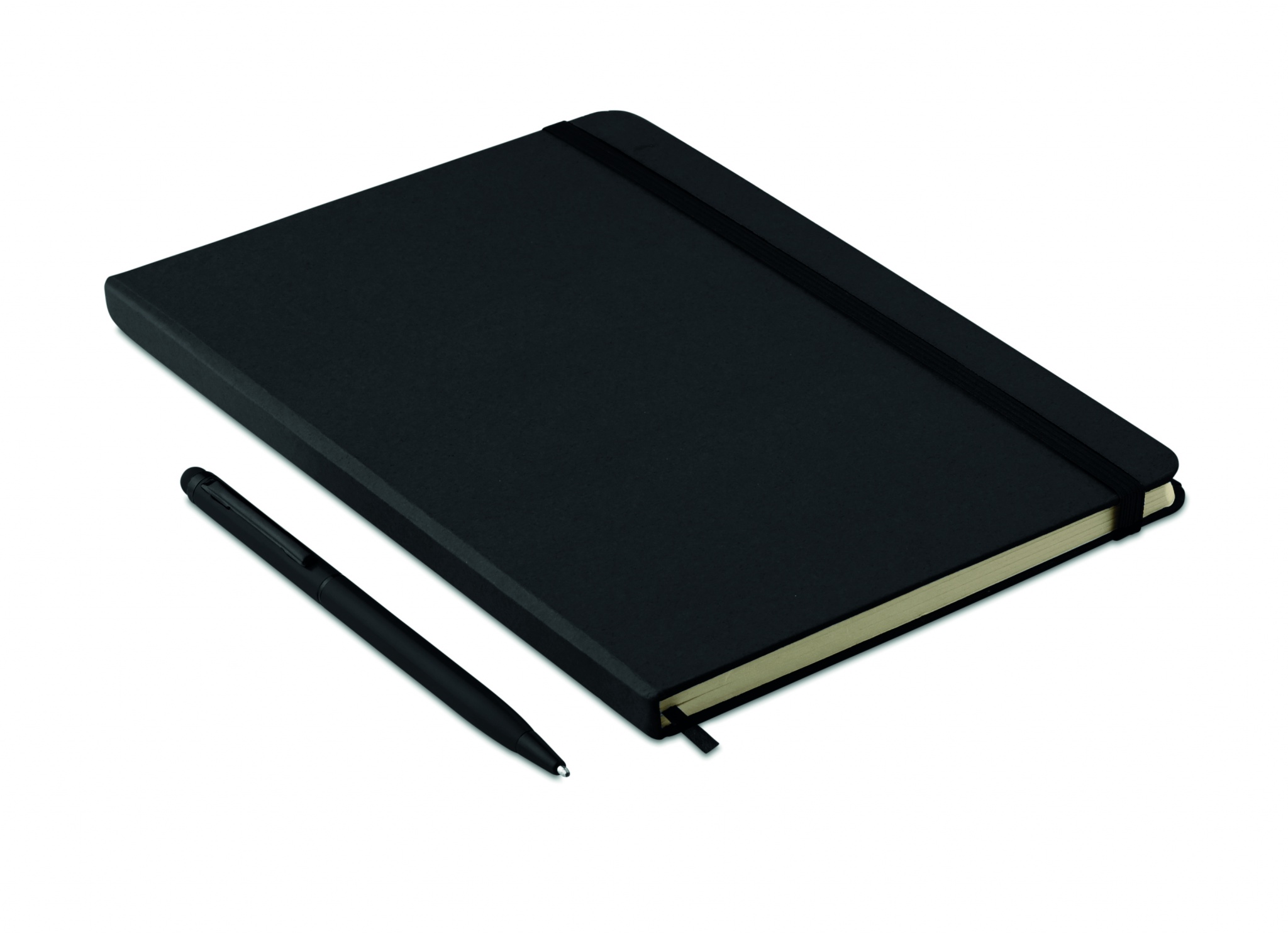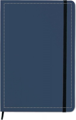 A5 notebook with 2-in-1 stylus ball pen. Hard PU cover. Casebound. 144 lined pages (72 sheets). Matching ball pen with touch screen stylus. Blue ink. Matching elastic closure strap and ribbon bookmark.