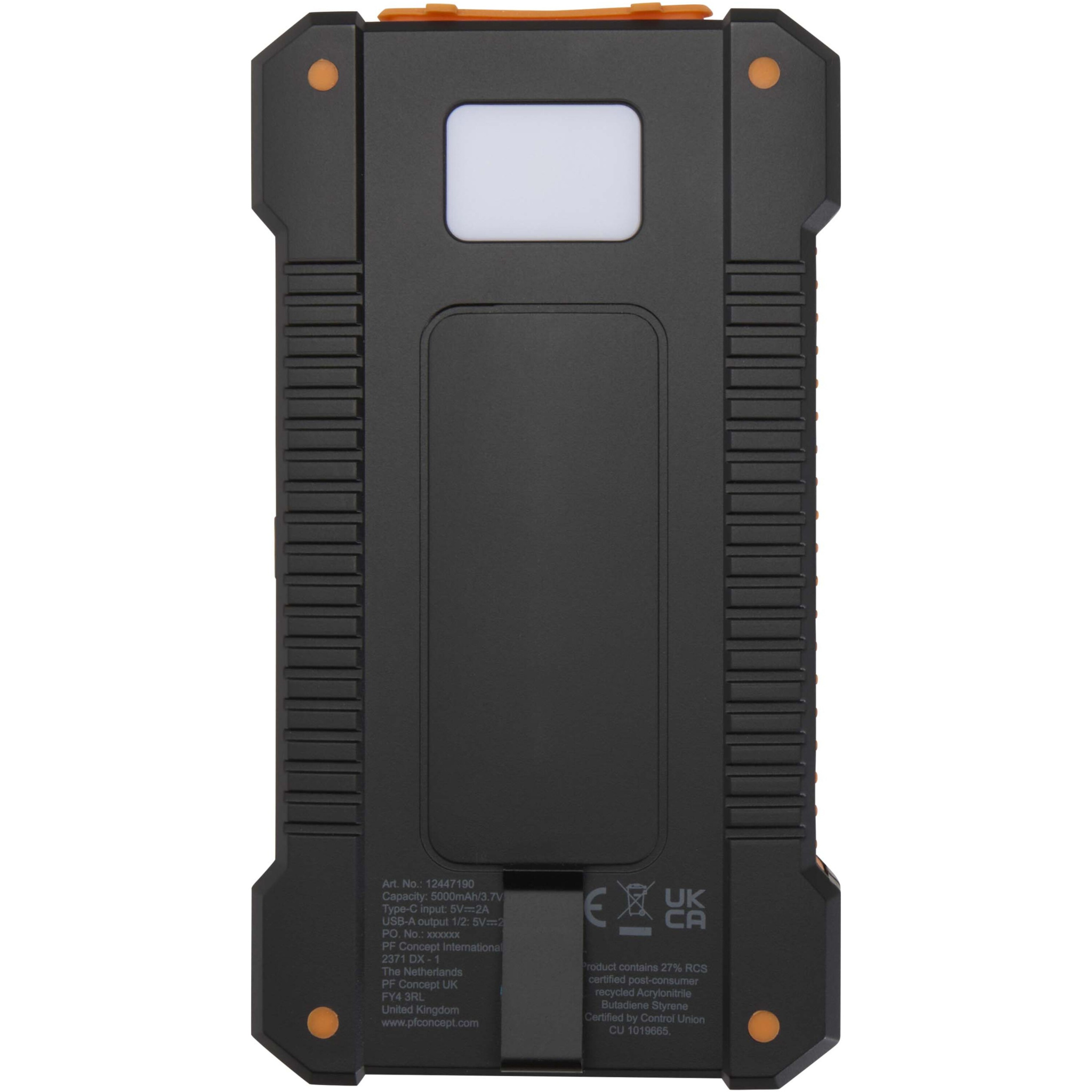Logotrade advertising product picture of: Altair 5000 mAh 10W recycled plastic rugged solar power bank with built-in torch