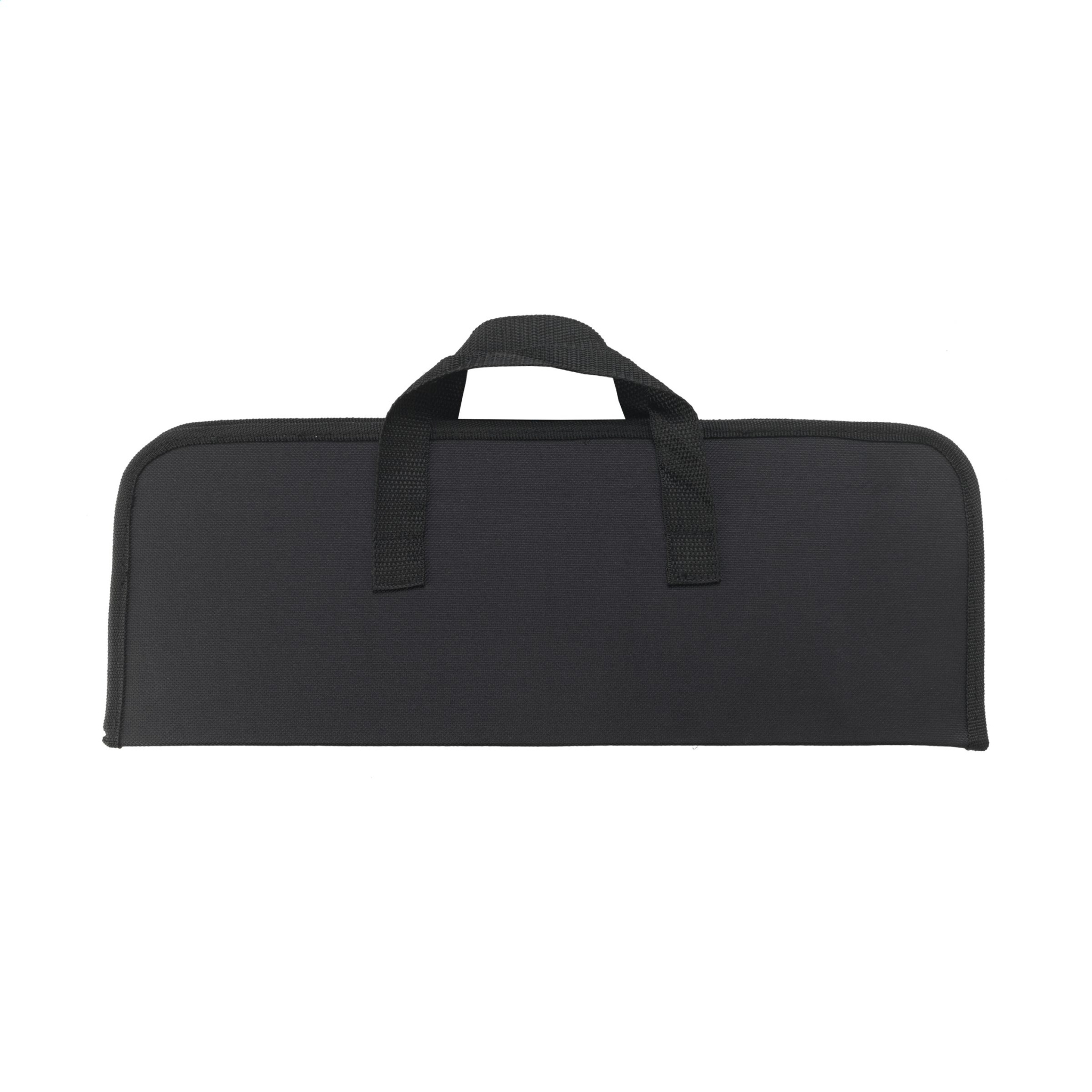 4-piece barbecue set: spatula, fork, knife and meat tongs. The stainless steel has a beautiful, black coating and the accessories have handles made from acacia wood. This chic set comes in a 600D nylon pouch.