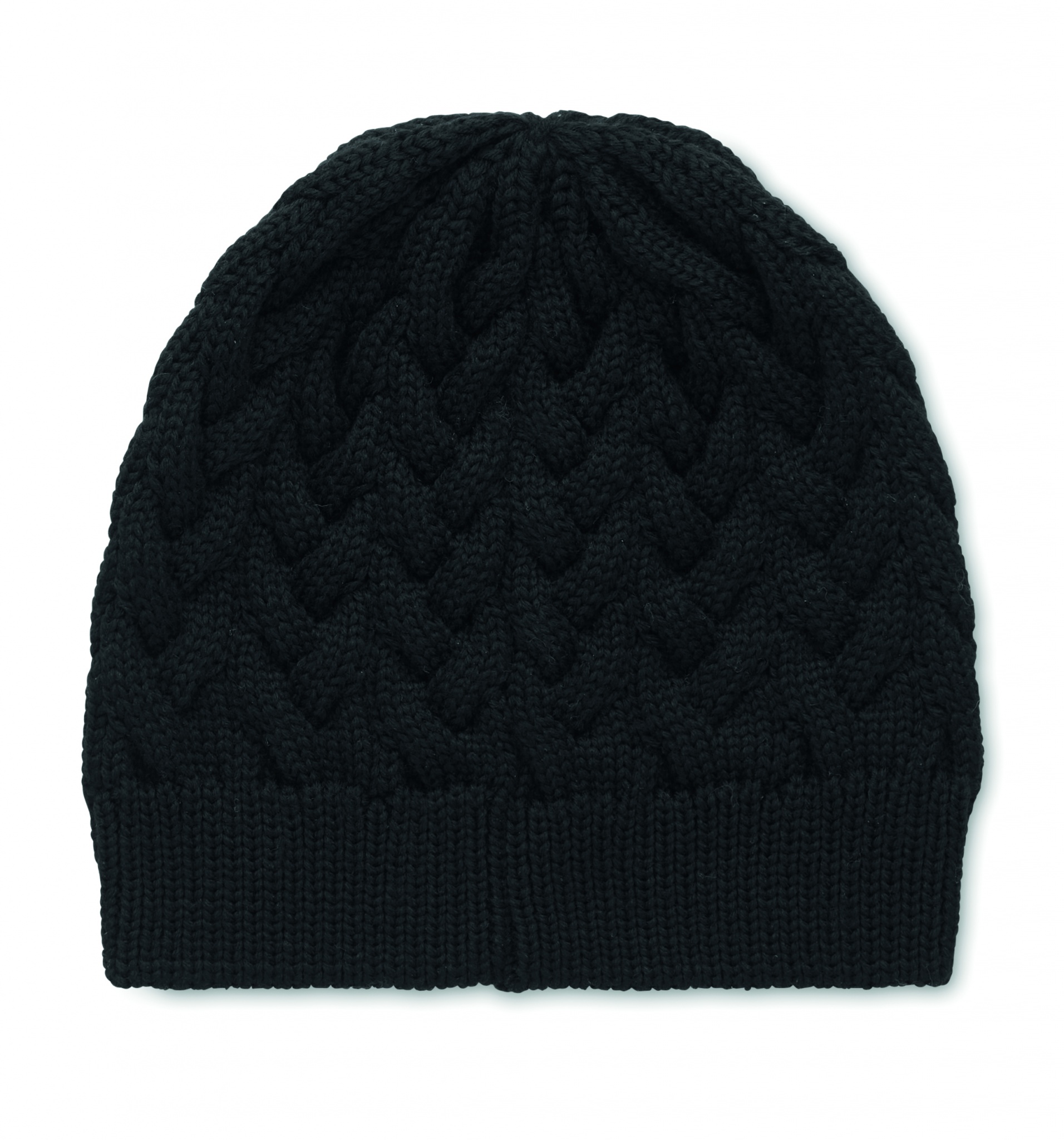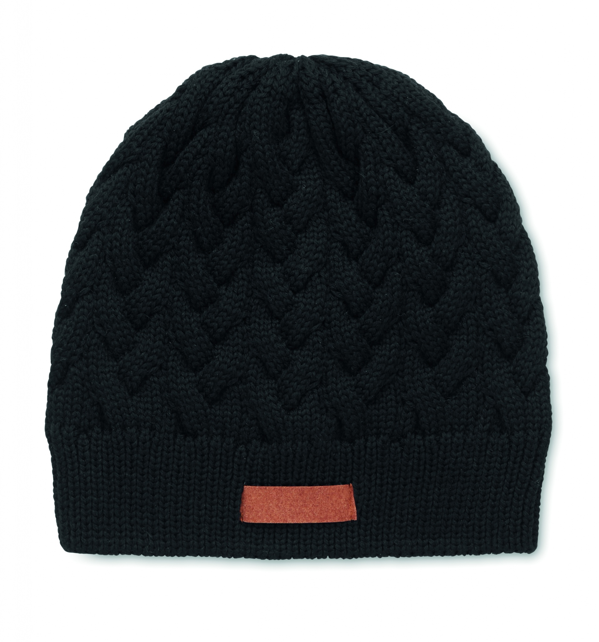 Cable knit beanie in RPET with label for printing area.