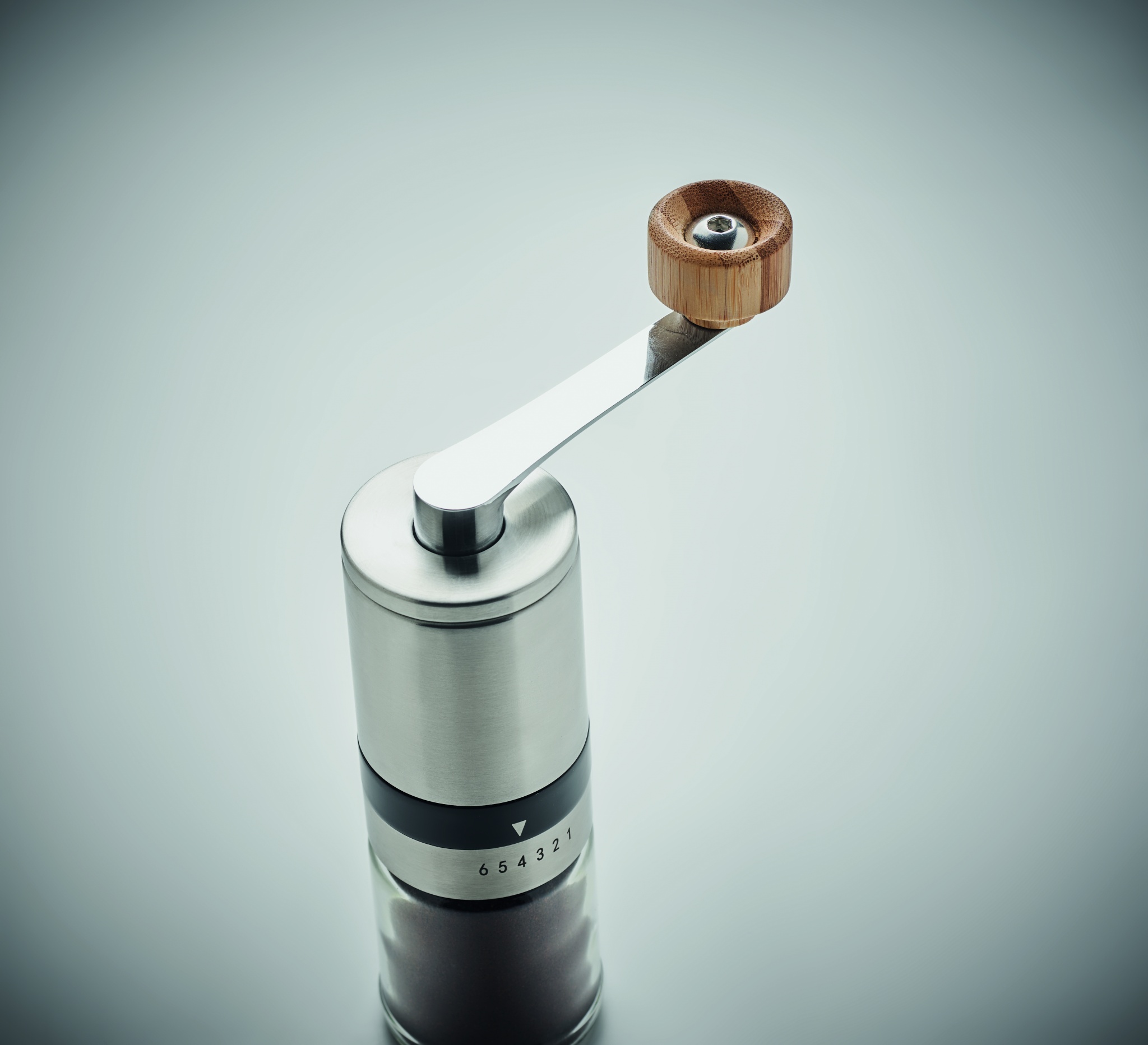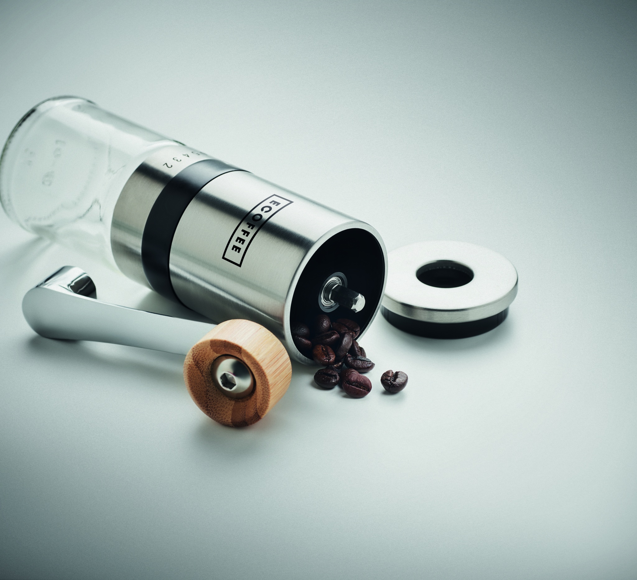 Coffee set. Including glass and stainless steel cafetiere and manual ceramic coffee grinder with bambo details. Capacity: cafetiere 350ml, grinder 100ml.