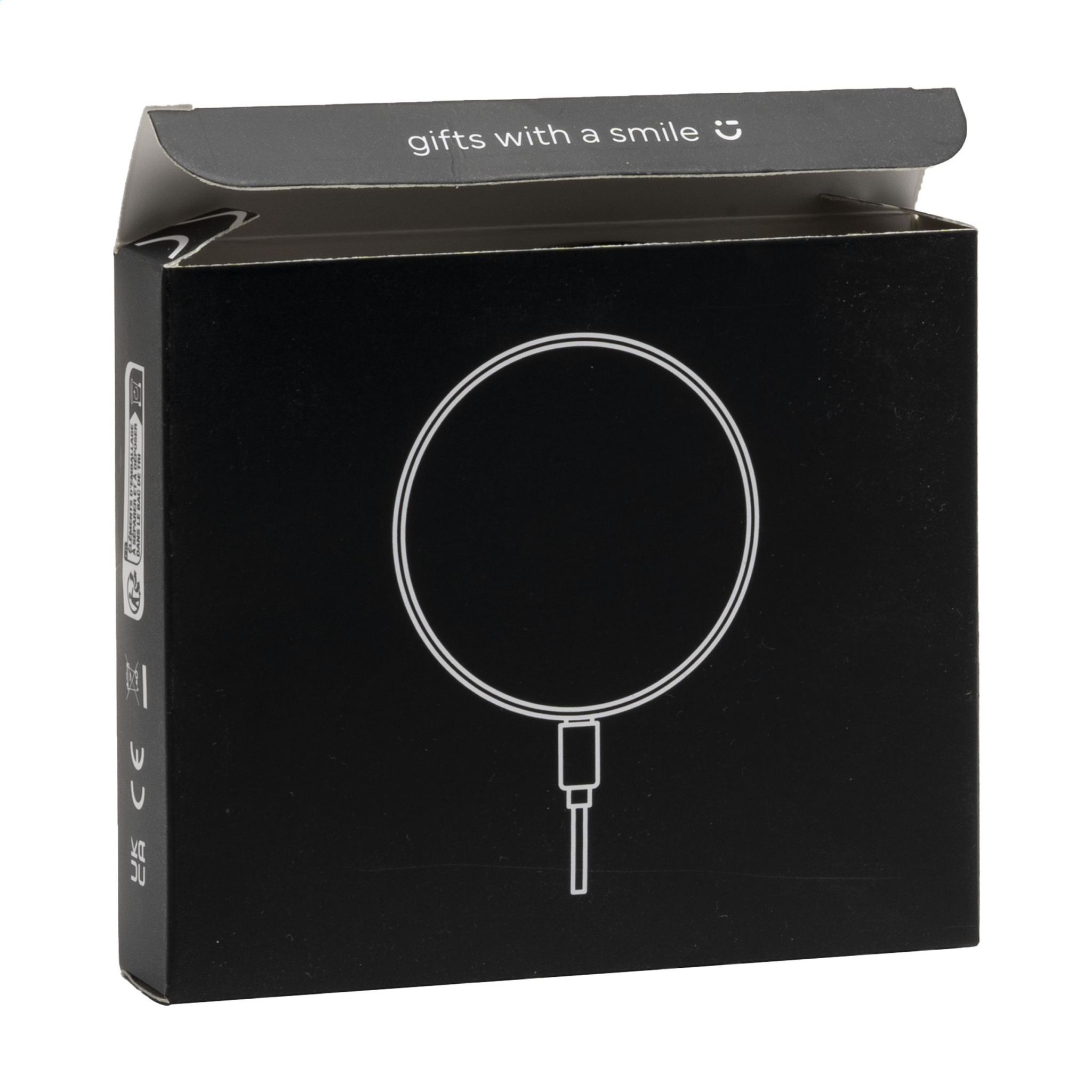10W wireless charger. The casing is made from recycled ABS plastic. Compatible with all mobile devices that support QI wireless charging (latest generation Android and iPhone 8 and above). Input: 9V/1.1A. Wireless output: 9V/1.1A 10W. Includes a cable (USB-A and type C) and user manual. This product and its accessories are PVC-free. RCS-certified. Total recycled material: 20%. Each item is individually boxed.