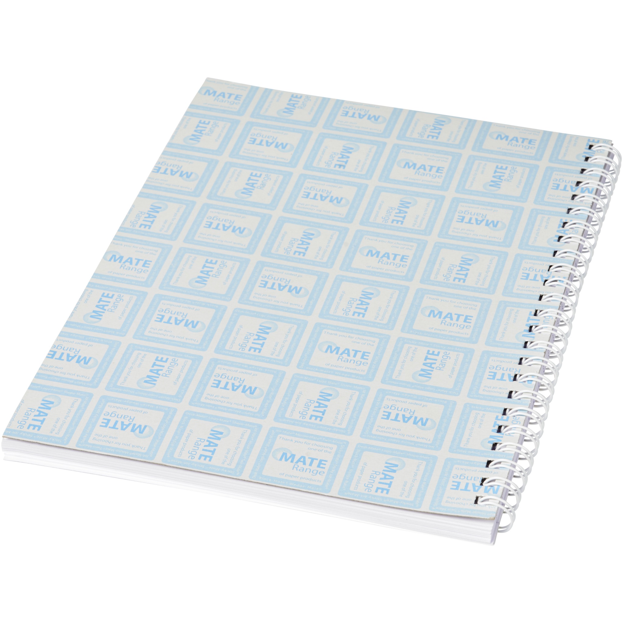 Desk-Mate® spiral A4 notebook. This notebook includes a white or black wire, a glossy card front cover (250 g/m2) and blank paper (80 g/m2). Standard delivered with 50 sheets, also available with 80 sheets. You can customise the pages of this versatile notebook with any design - so whether you want lined paper, squares or dots - anything is possible!
