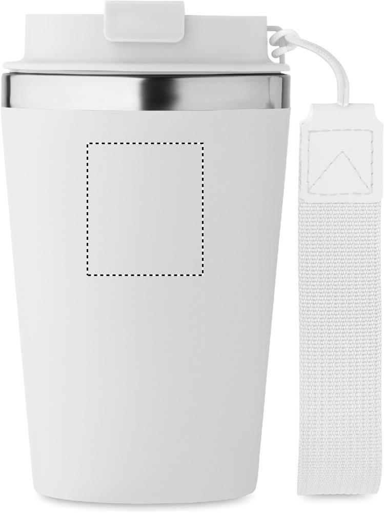 Double wall tumbler in recycled stainless steel (90% recycled stainless steel and 10% stainless steel) with recycled PP outside layer with RPET wrist strap. Leak-free. Capacity: 350 ml.
