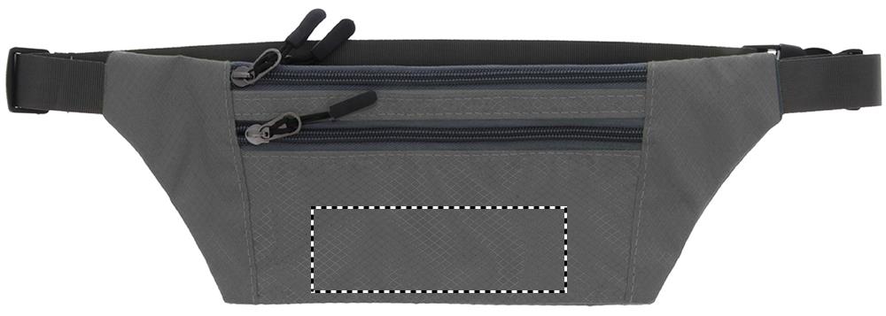 Fanny bag in jacquard polyester with 2 zippered front and 1 zippered back compartment and adjustable waist strap.