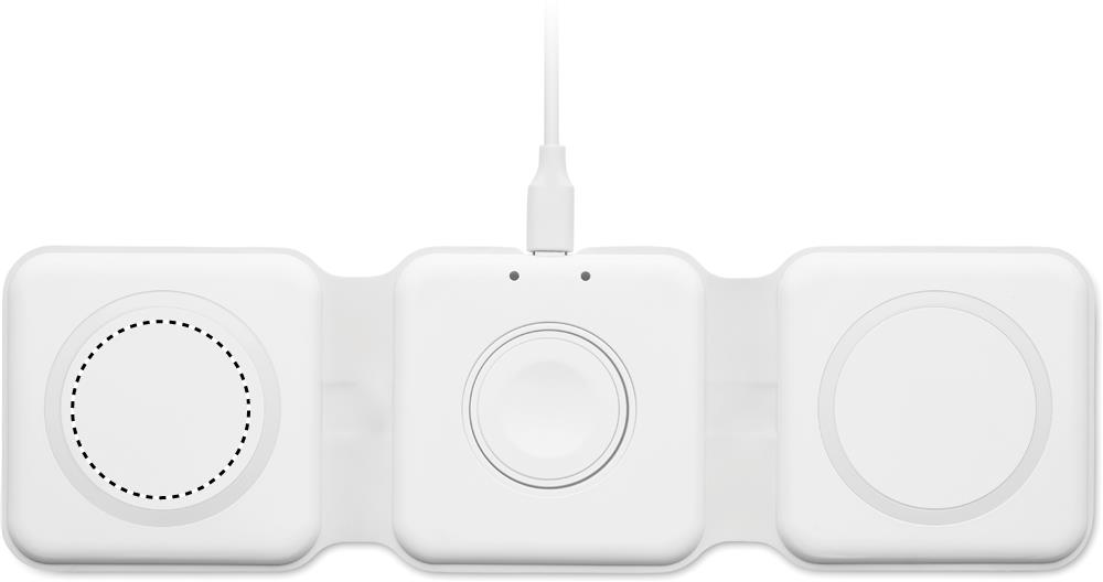 3 in 1 foldable charging station in ABS. It has 3 wireless charging spots (15W). Input: 2-in-1 Type-C and Type-A. Compatible with all QI enabled devices such as latest Androids, iPhone® 8, X and newer. Also compatible with iWatch.