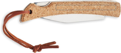 Foldable knife in stainless steel and cork covered handle with PU cord. Cork is a natural product, there may be slight variations in colour and size per item, which can affect the final decoration outcome.