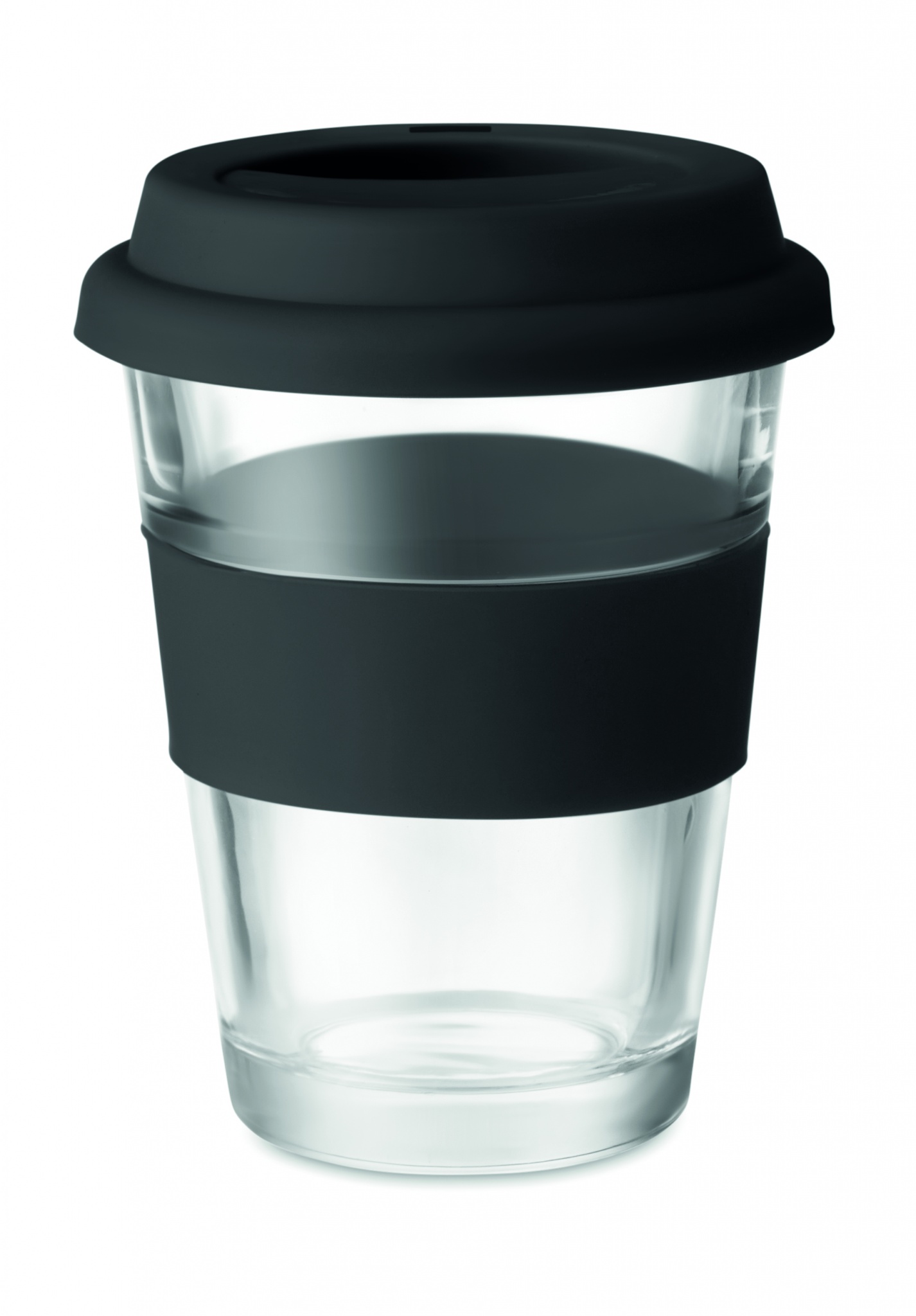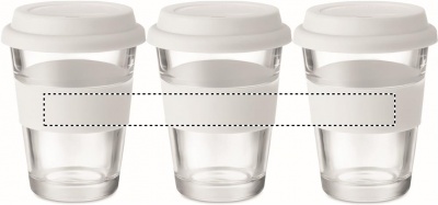 Glass tumbler with silicone lid and grip. Capacity 350 ml. As this is a single wall mug heat transfer can still occur.