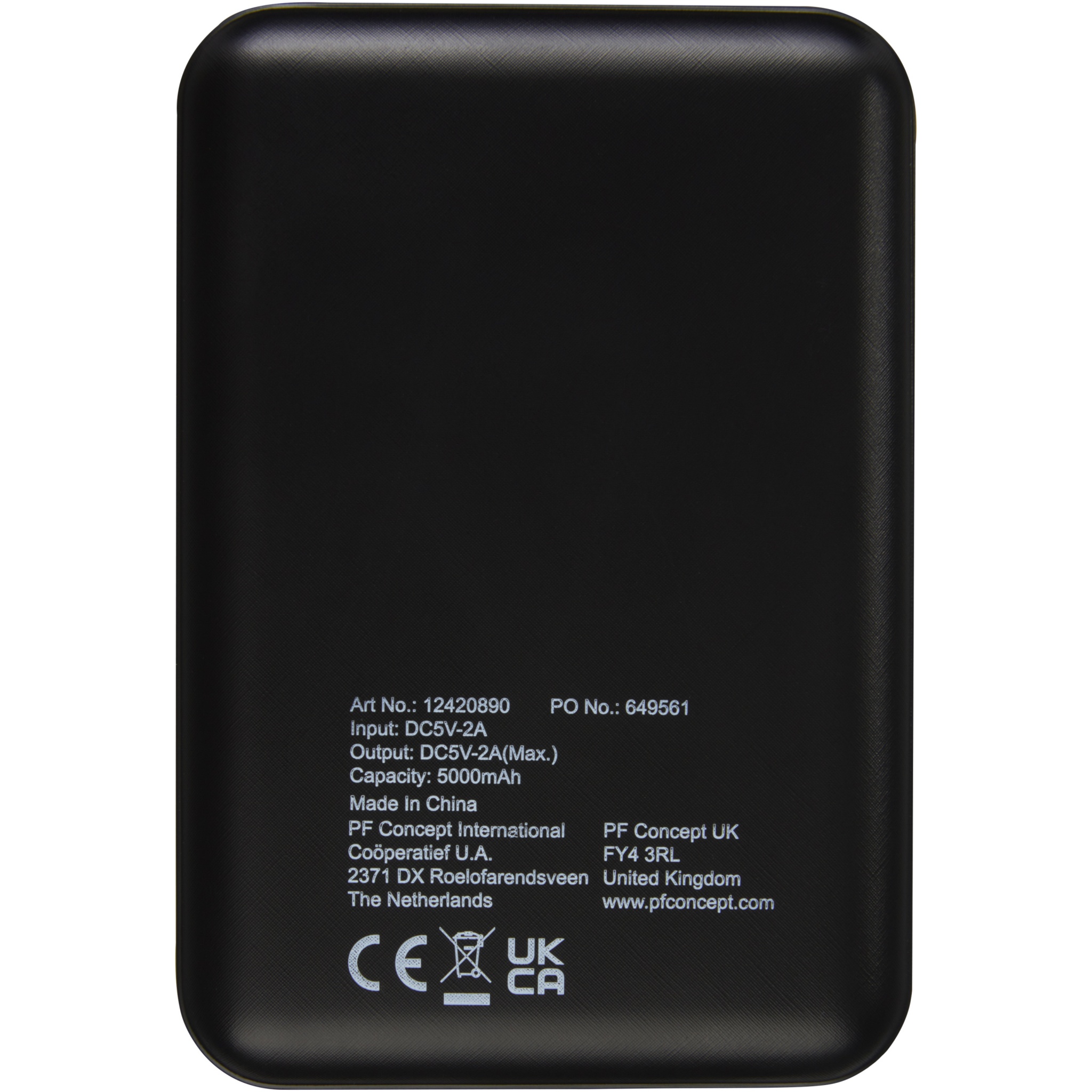 Flat and durable power bank with a 5000 mAh polymer battery. Can be laser engraved on the front panel, which will light up the logo when the power bank is turned on or being used. Output: 5V/2A. Input: 5V/2A. No accessory cable provided for sustainability purposes.