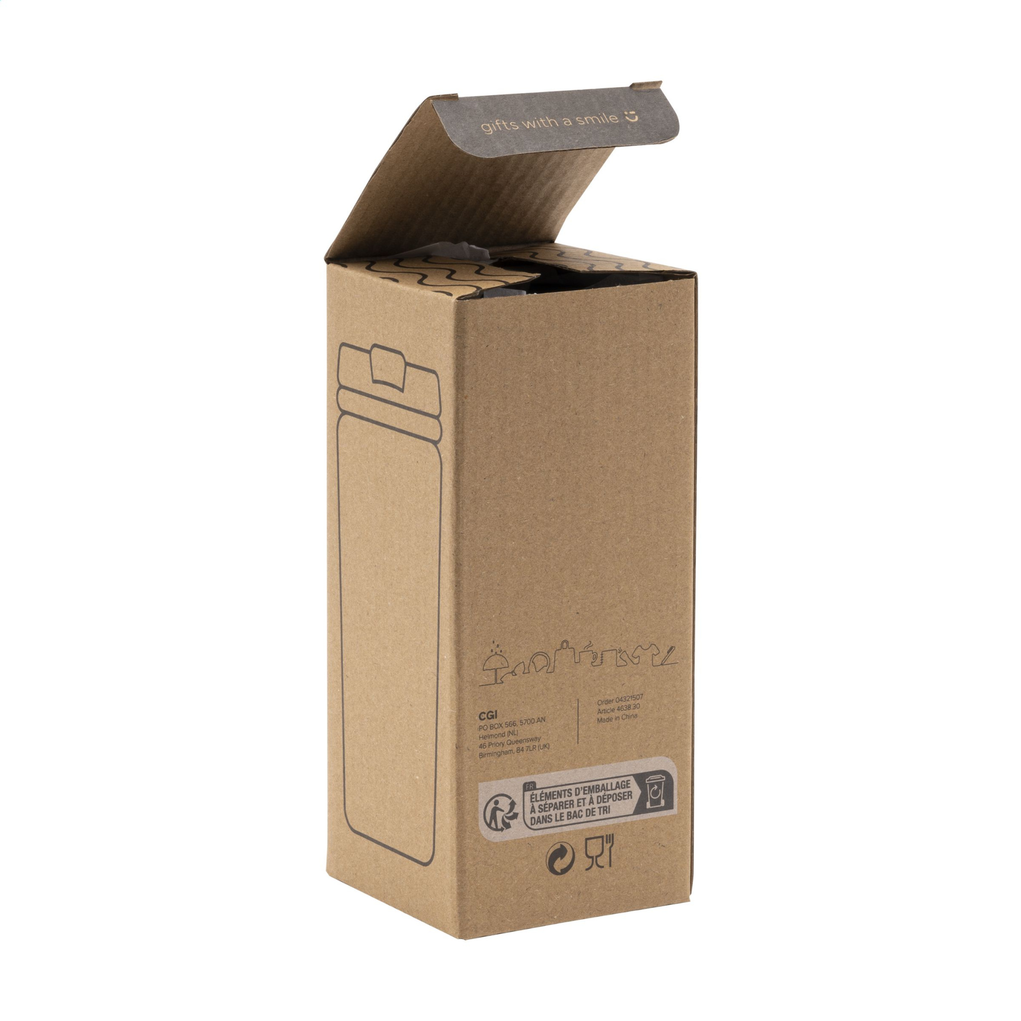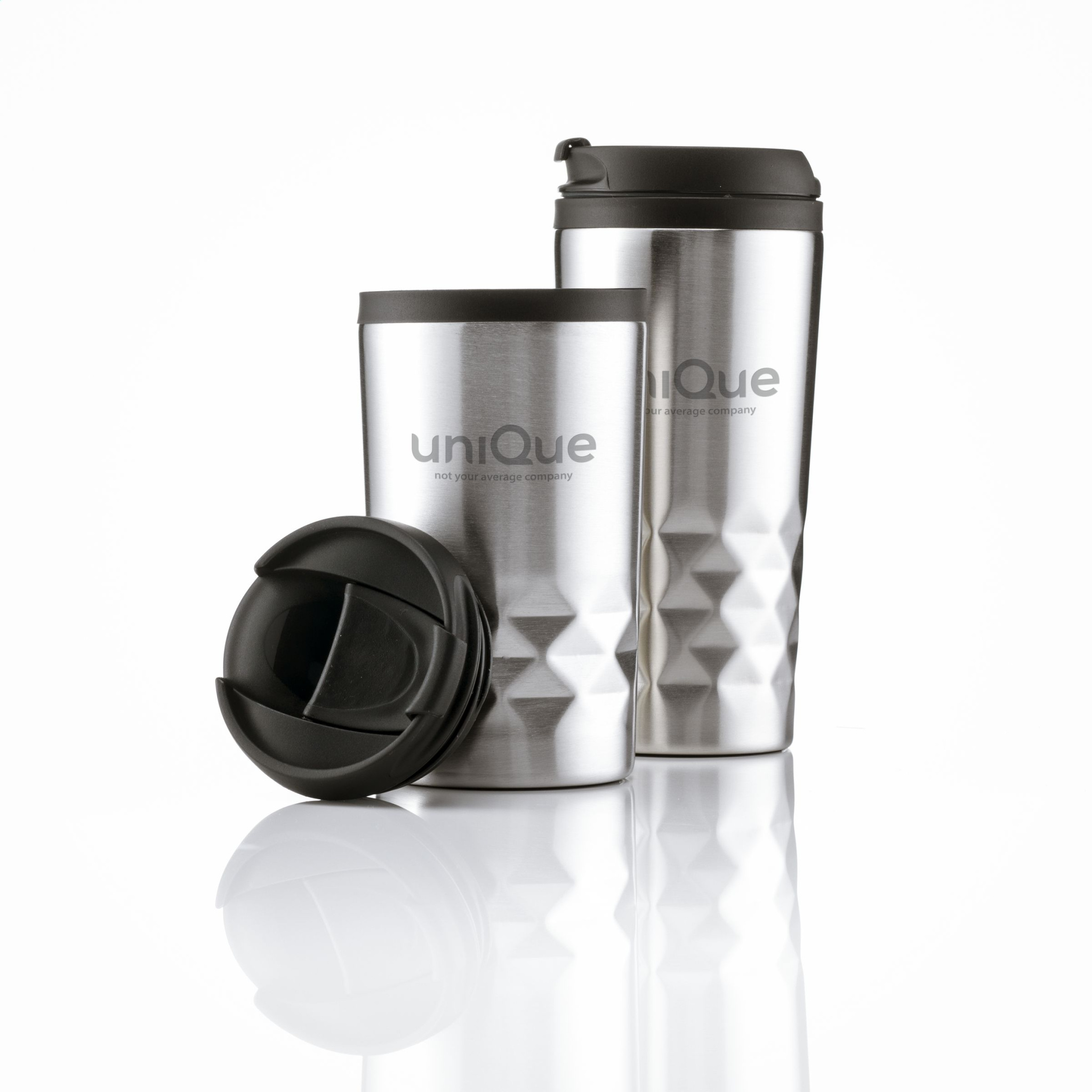 Double-walled, leak proof stainless steel thermo cup with screw cap, click opening. PP inner wall. With distinctive 3D geometric diamond pattern on the holder. Non slip base. Capacity 300 ml. Each item is individually boxed.