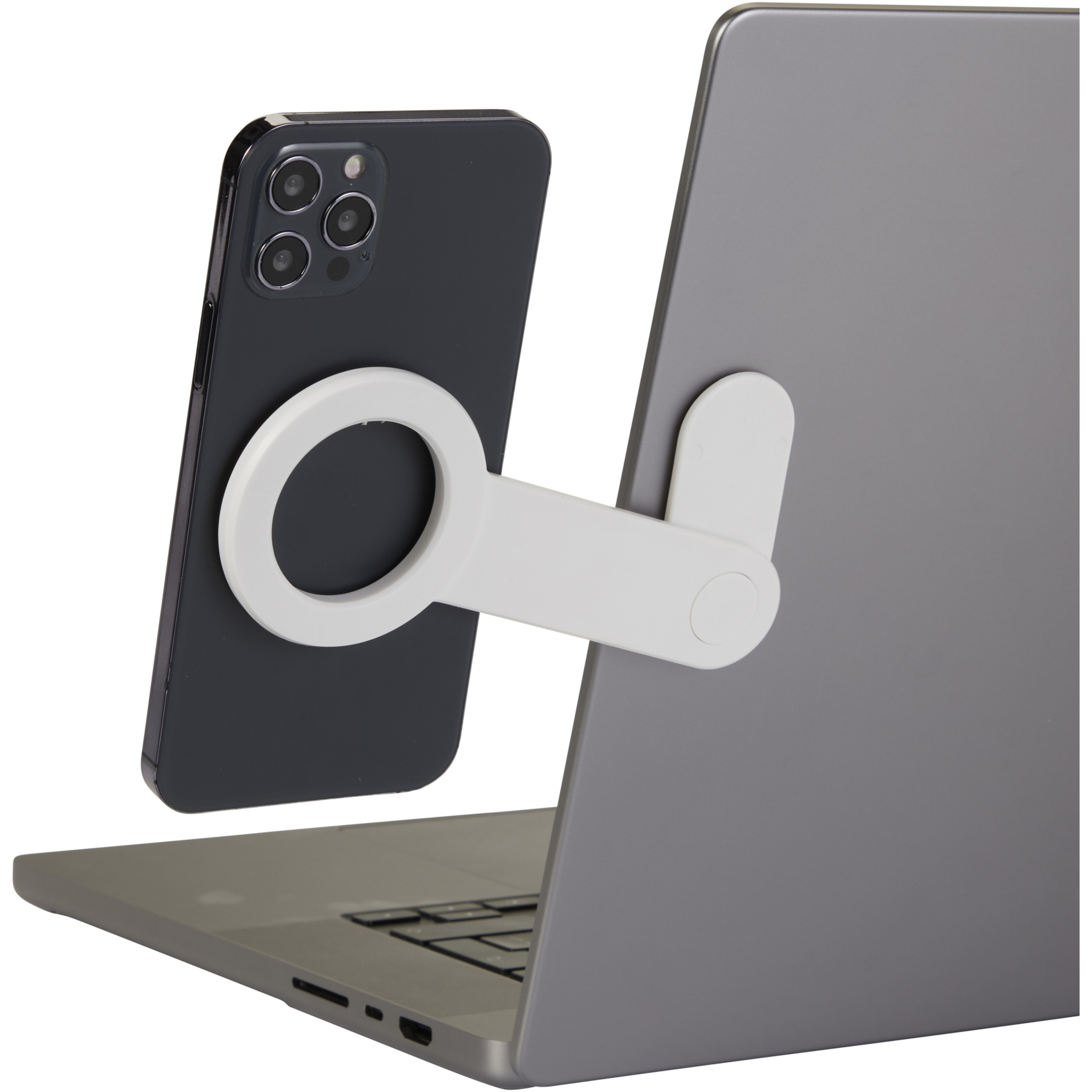 Phone holder made from recycled plastic, making it a more sustainable choice. With this dual-screen desktop setup multitasking is made easy. It is very easy to install and use, just attach the extra strong 3M sticker of the mounting base at the back of the desktop or laptop monitor, and then turn the bracket arm of the holder to expose the magnetic ring and attach your phone. It also includes a metal ring for non-magnetic phones or cases.
