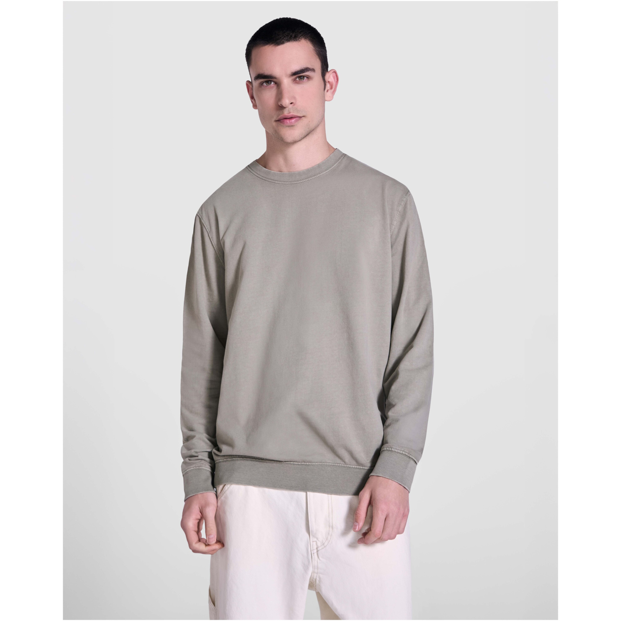 Unisex sweater with an acid-wash finish. 2x1 ribbed collar, cuffs and hem in tone. Reinforced seams at cuffs, hem, waistband and armholes. Tone-on-tone cover stitch at the neck.