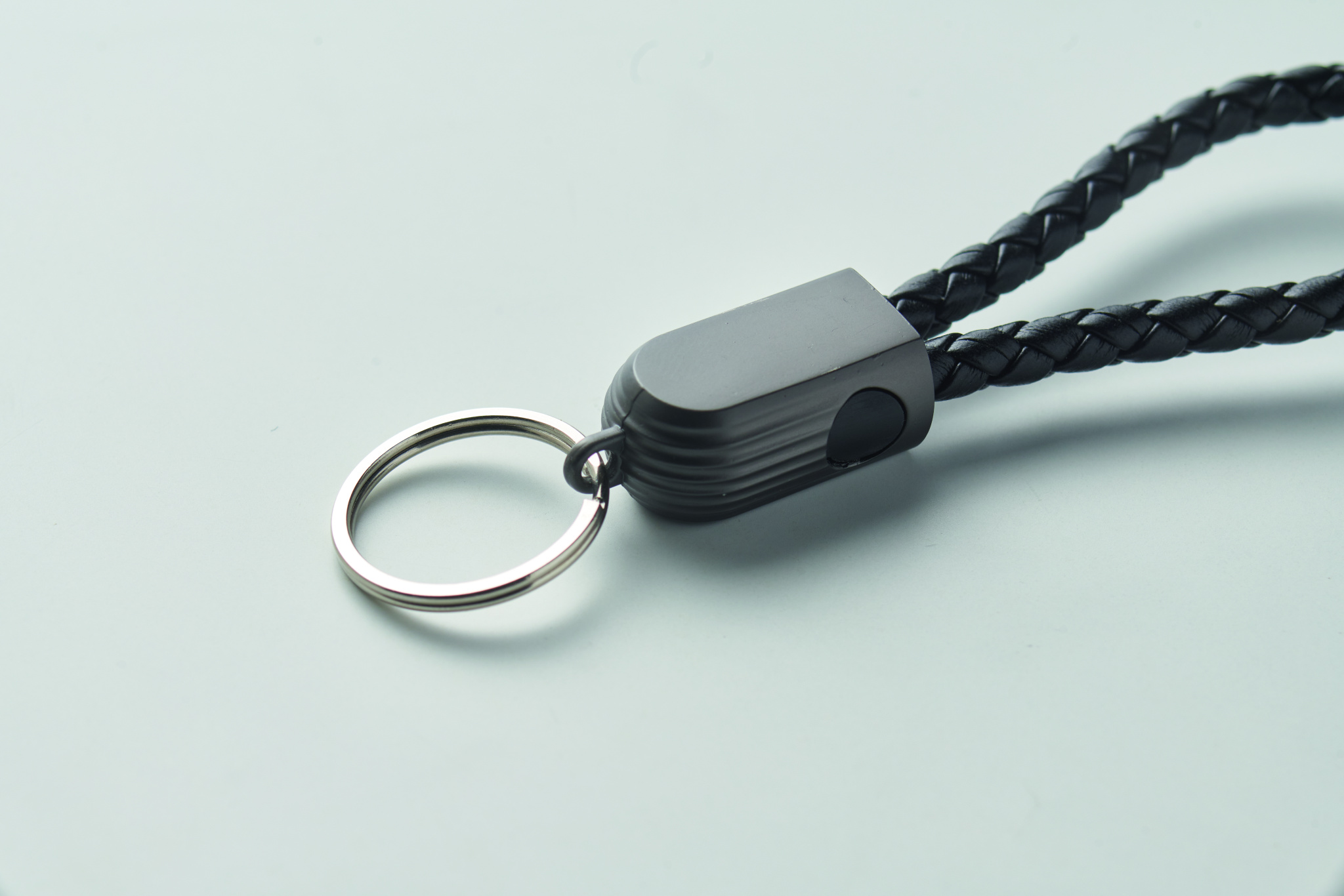 Key ring loop with charging and data transfer 60W cable type-C to type-C in PU with zinc alloy braided detail.