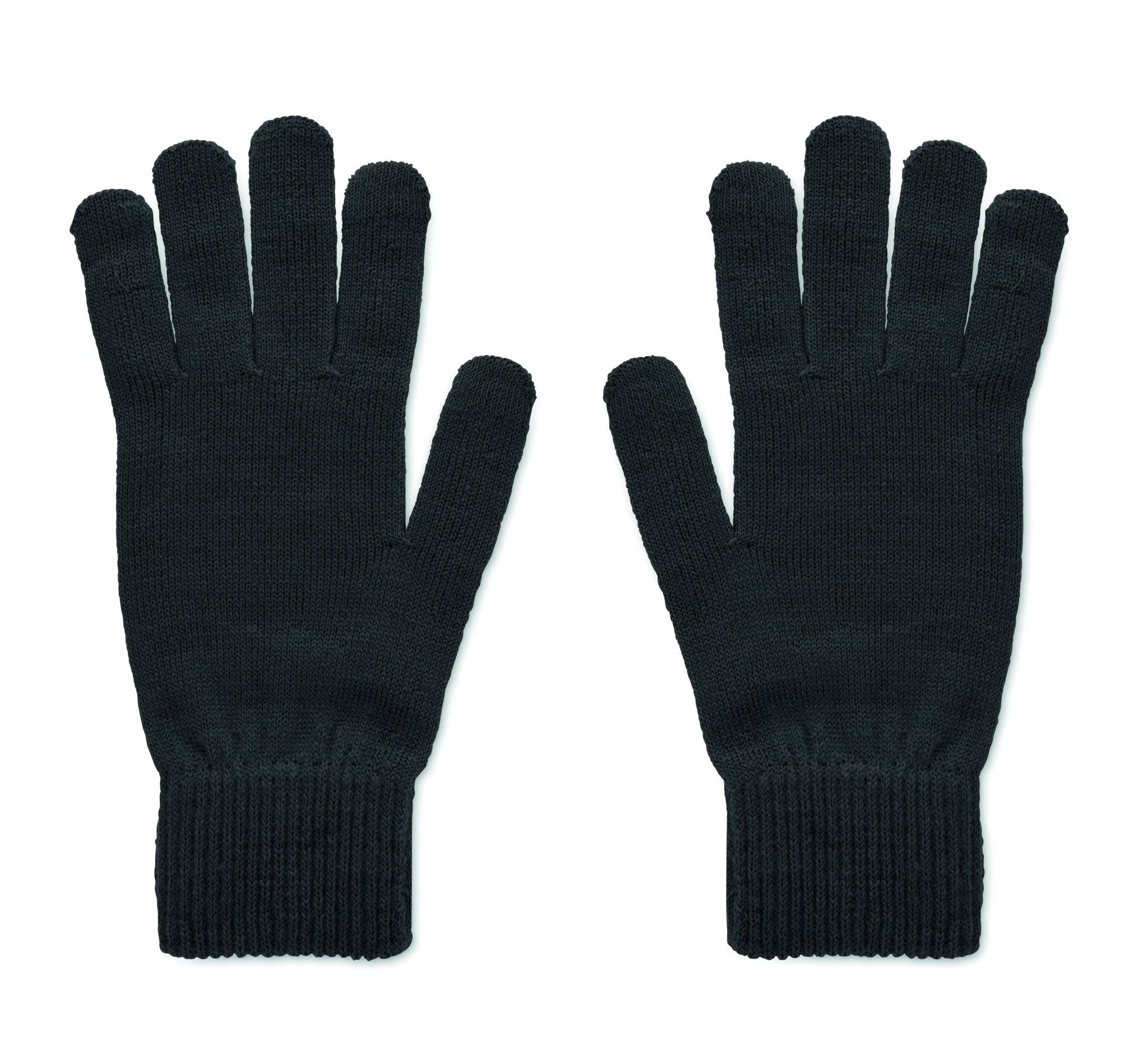 Knitted gloves in soft stretchable RPET polyester with decoration patch.
