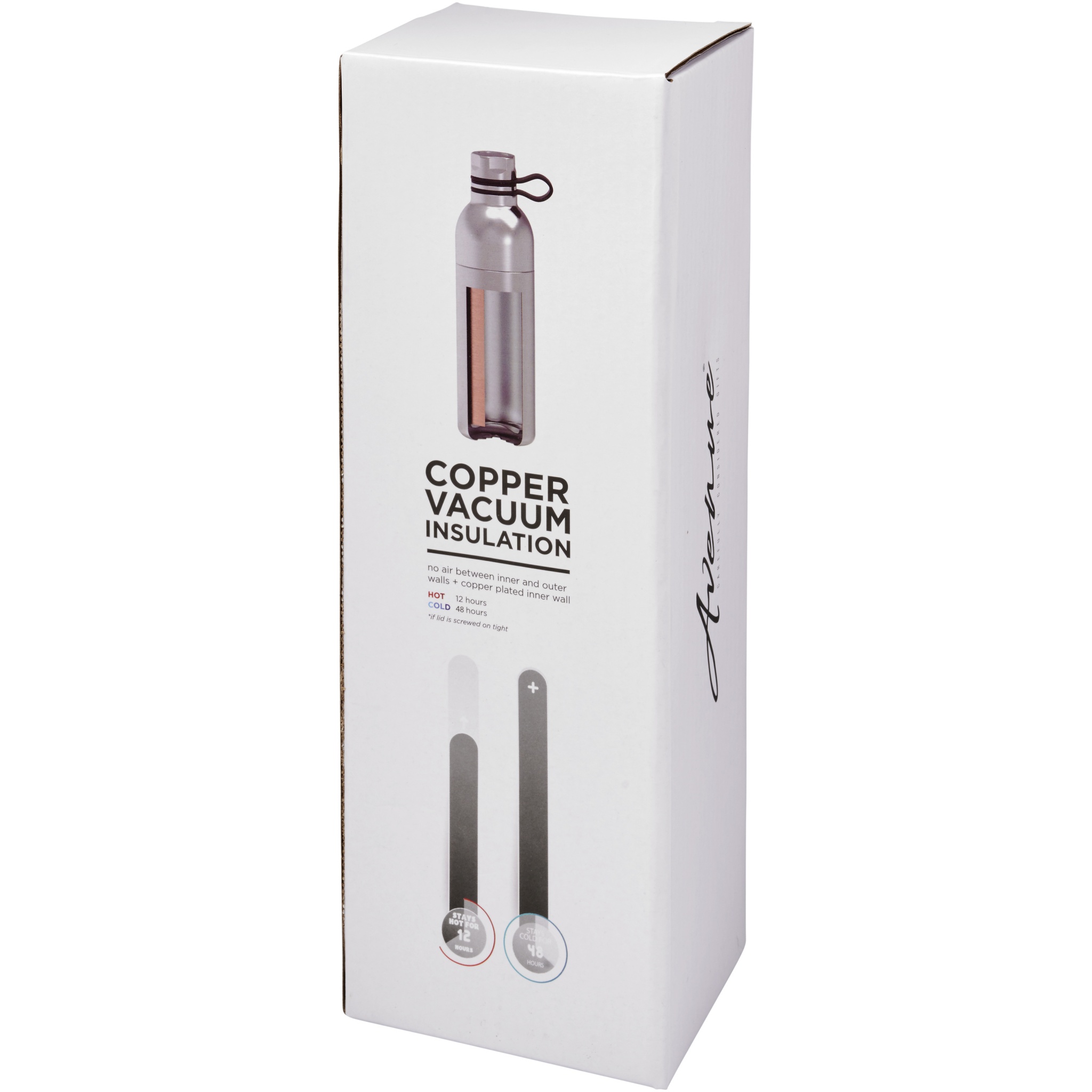 Double-wall stainless steel vacuum construction with copper insulation, which allows beverages to stay cold for 48 hours or hot for at least 12 hours. The construction also prevents condensation on the outside of the bottle. Features a screw-on top and stainless steel lid with a comfortable silicone handling loop. Dual opening construction for easy cleaning and filling. Volume capacity is 590ml. Presented in an Avenue gift box.