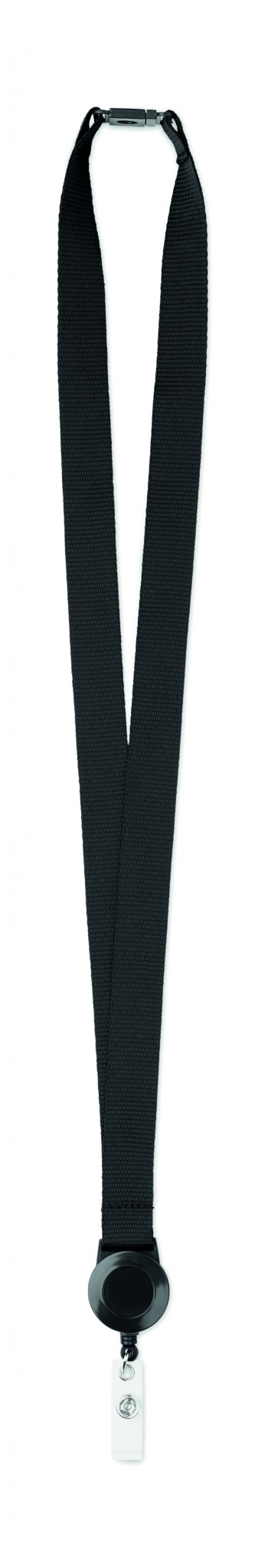 Lanyard in polyester with retractable badge holder and safety breakaway. 20mm wide. Sublimation print available on white item only.