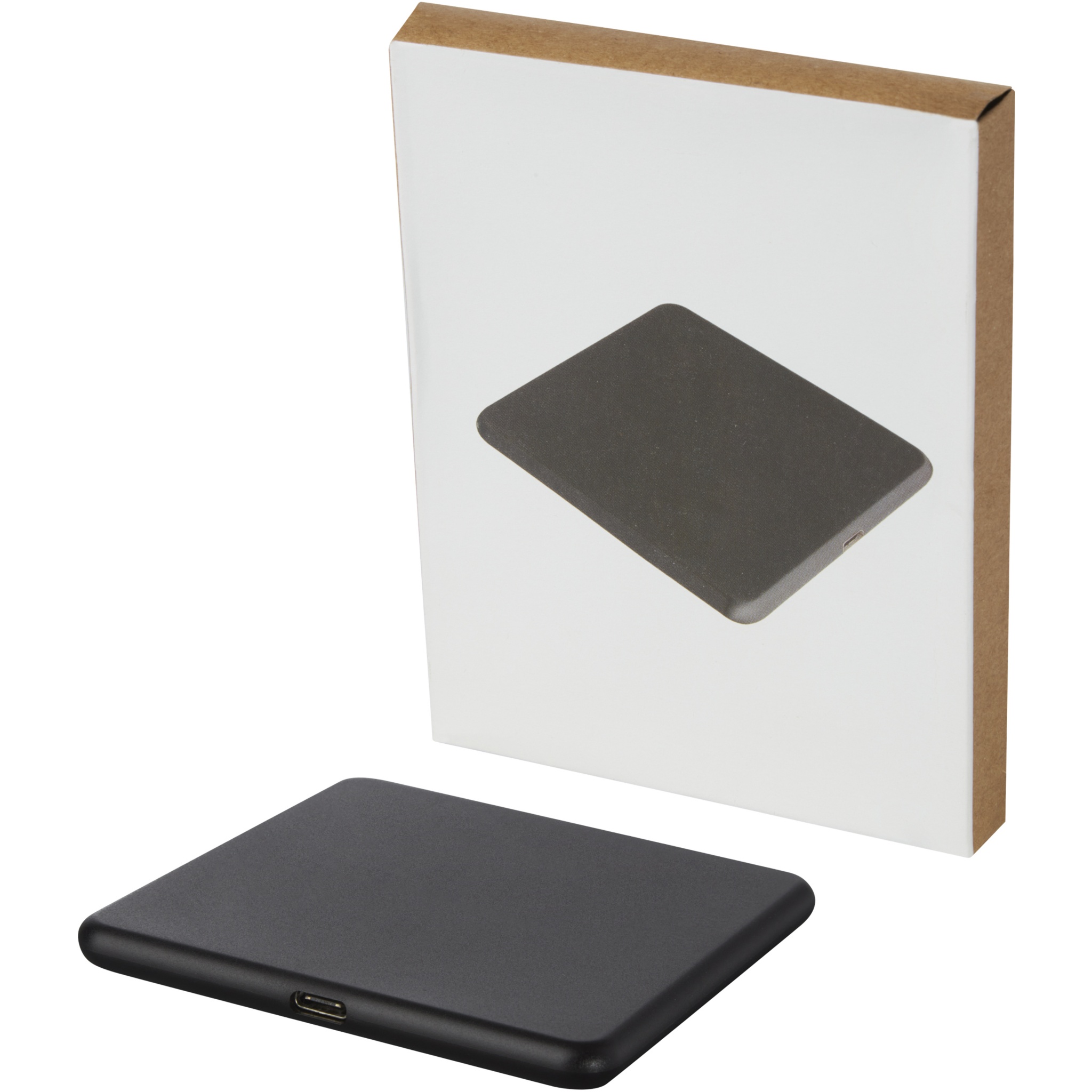 Wireless charging pad made of recycled ABS plastic. Connect the charging pad to a computer or laptop and place the device on top to start charging. Wireless output is 10W (max) for quick charging. Compatible with all Qi devices (iPhone 8 or above and Android devices that supports wireless charging). Delivered in a gift box with an instruction manual (both made of sustainable material).