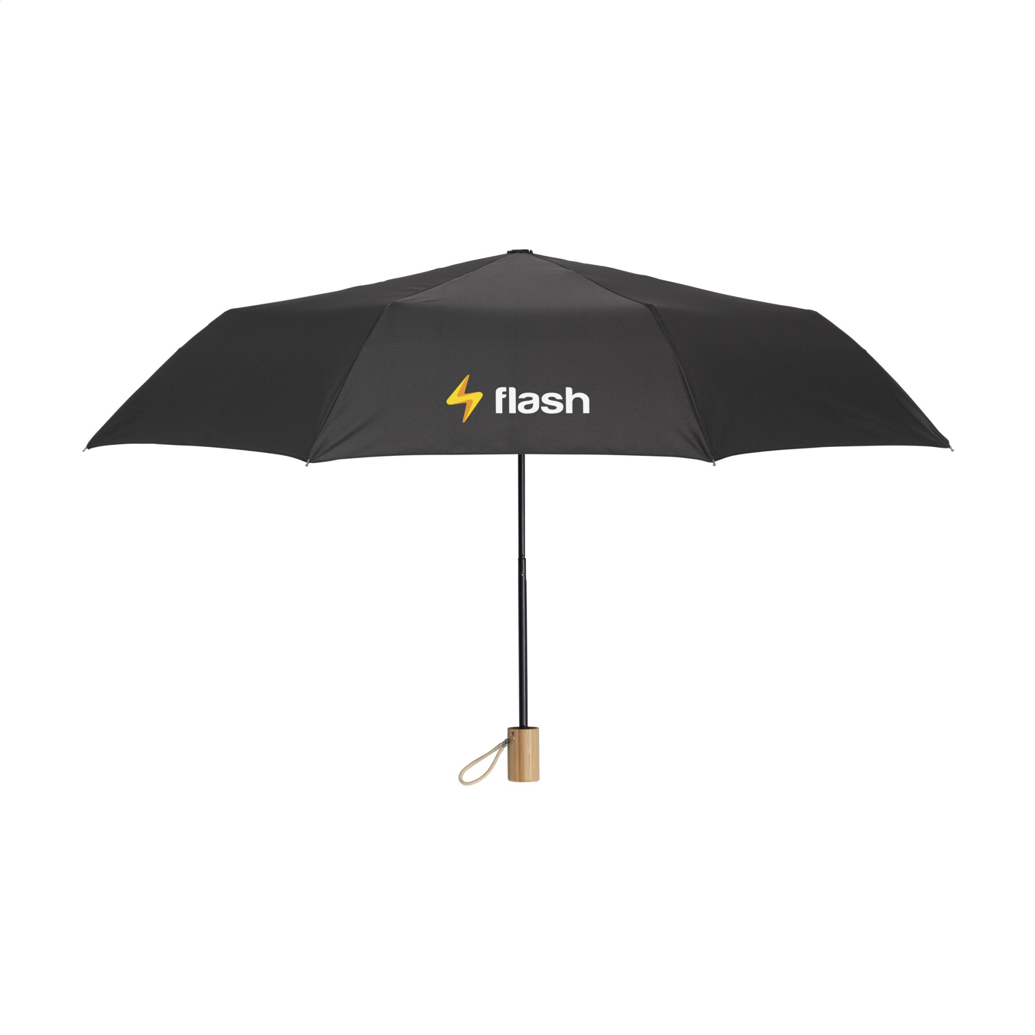 WoW! Foldable umbrella made from 190T RPET pongee polyester. With stainless-steel shaft and frame, beautiful bamboo grip with cotton loop, Velcro closure, storage pouch and RPET label. Manual operation. RCS-certified. Total recycled material: 18%.