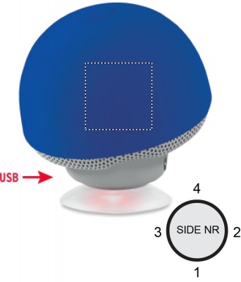 Mushroom shaped 5.0 wireless speaker/phone stand in ABS with suction cup. 1 Rechargeable Lithium 180 mAh battery included. Including USB charging cable and 3,5 mm plug. Output data: 4 Ohm, 5V and 3W. Playing time aprox. 2h.