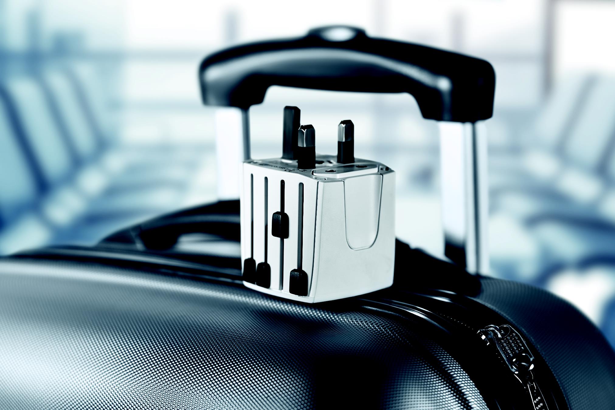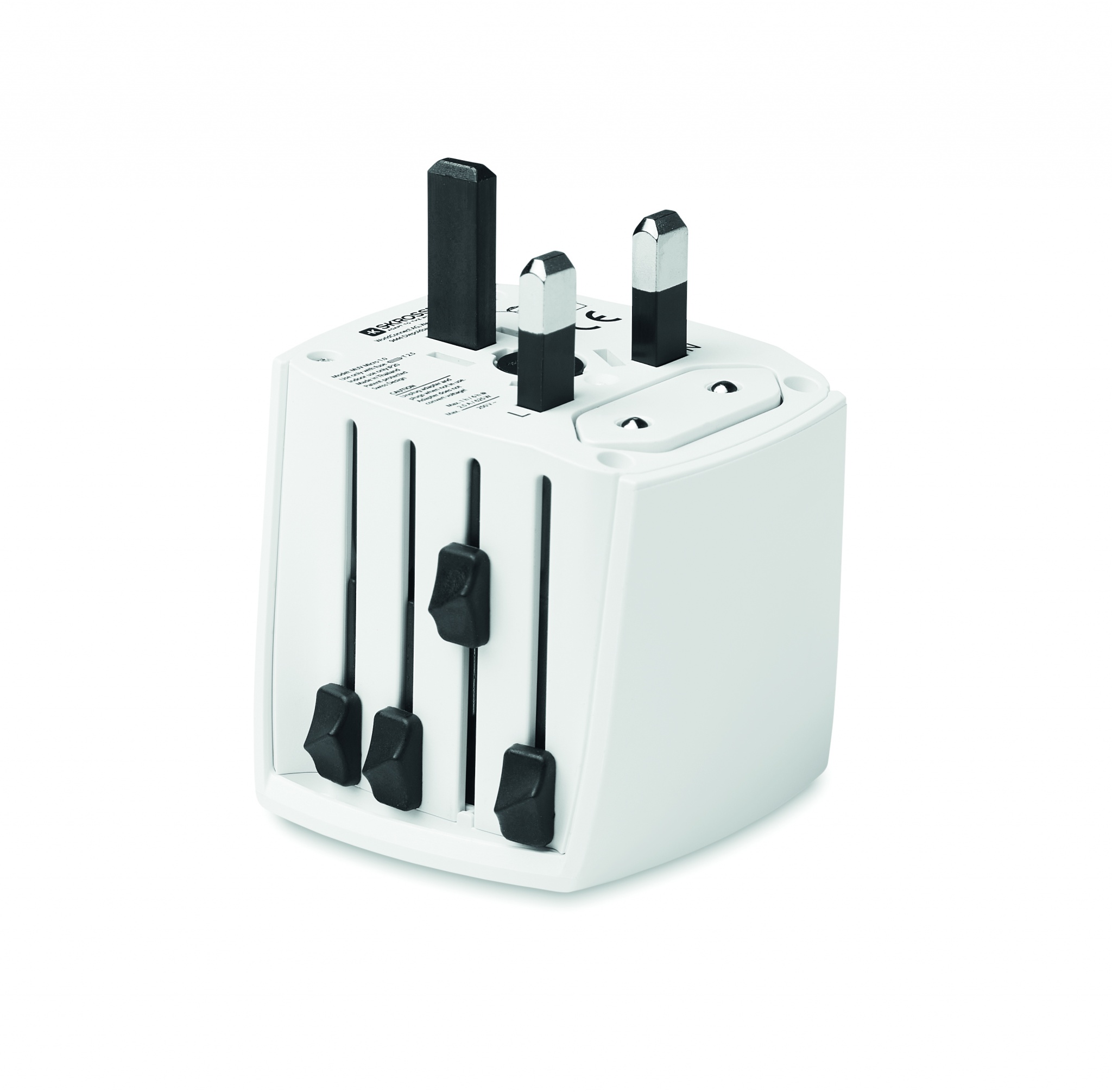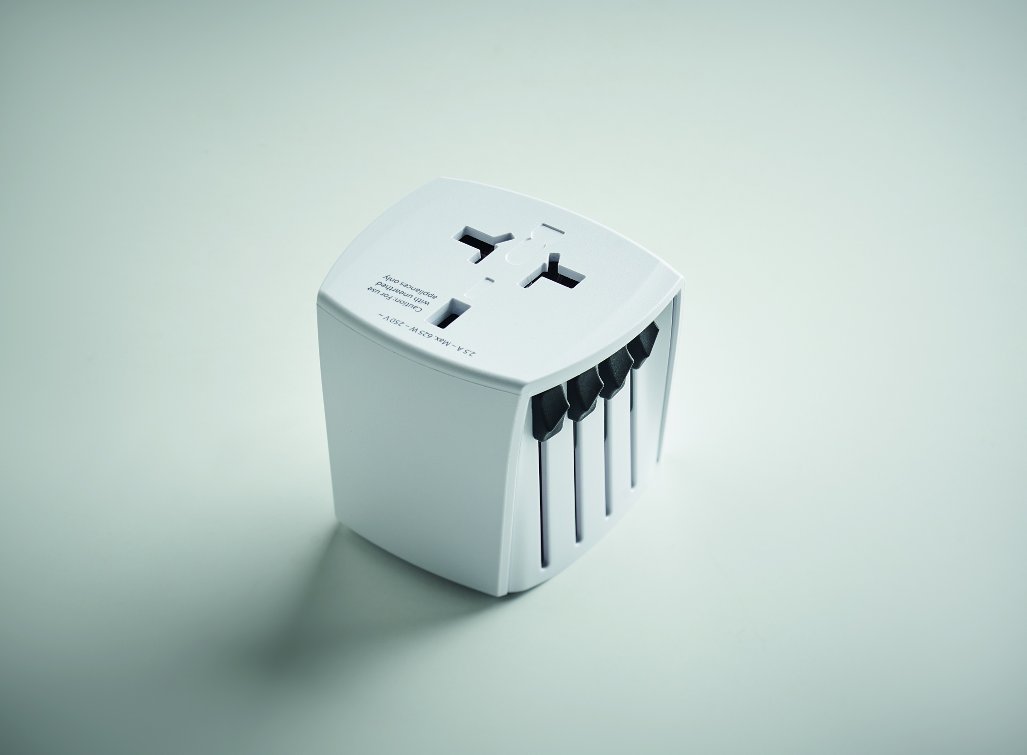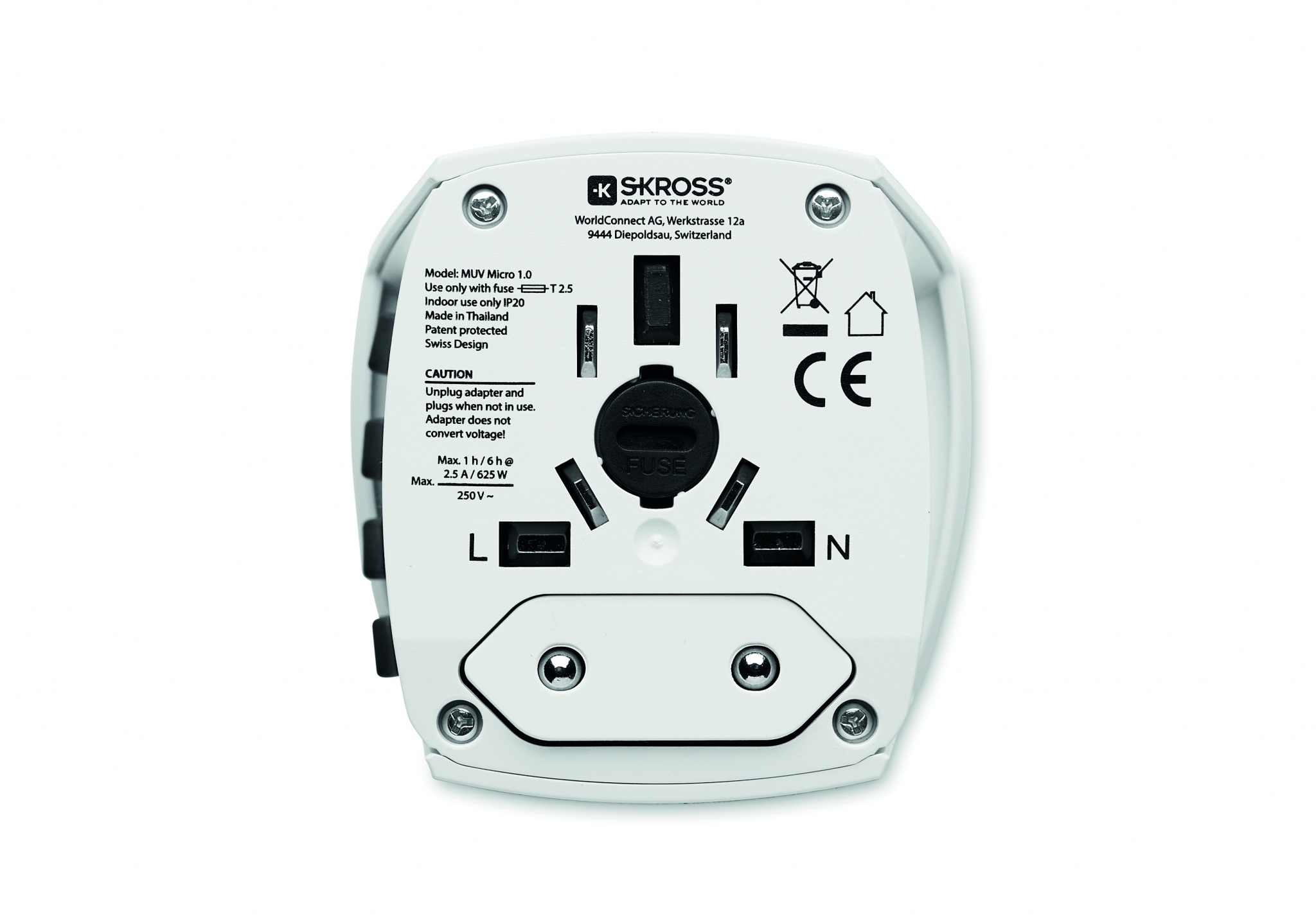 Universal SKROSS® travel adapter. Receptacles for Europe, USA/Japan, Australia/China.   2-pole, unearthed. Fulfils all international security-relevant standards and norms. Even child safe.