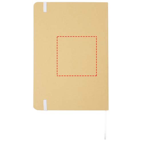 Hard cover A5 notebook made of recycled cardboard with 80 lined sheets of 70 g/m² paper. The notebook has an elastic closure, a ribbon, and rounded corners.
