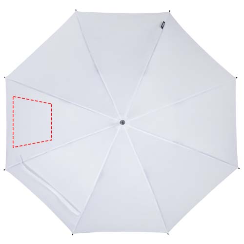 23” automatic opening umbrella with a recycled PET pongee polyester canopy. It has a sturdy metal shaft, fiber glass frame, and a comfortable EVA handle with colour matching end. Large print area on each of the panels.