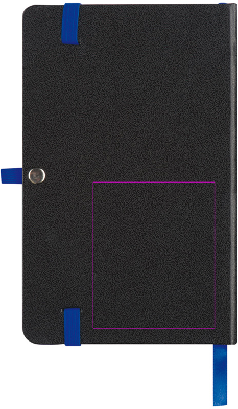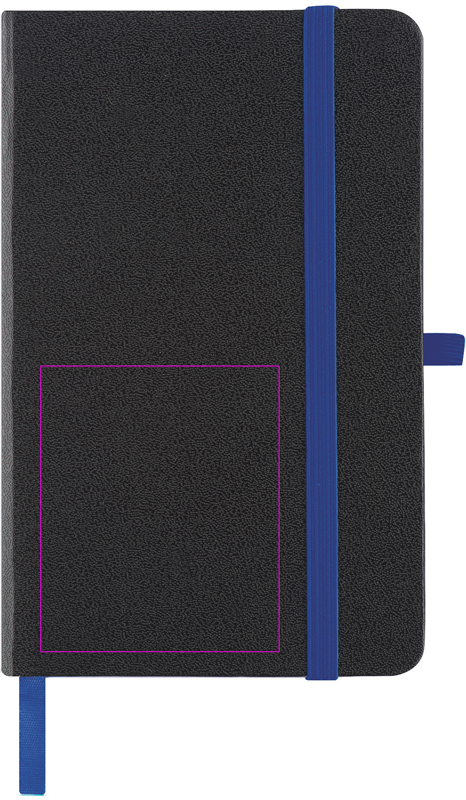 Notebook with black PU cover and 160 lined pages. Elegant look through colorful accents. We will print your logo on the cover.