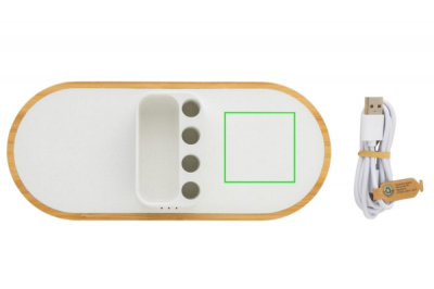 Dual 10W fast wireless charger with pen holder made with RCS (Recycled Claim Standard) certified recycled ABS. Total recycled content: 31% based on total item weight. RCS certification ensures a completely certified supply chain of the recycled materials. The base is made from FSC®100% bamboo. Wireless charging compatible with Android latest generations, iPhone 8 and up. Can charge two phones at the same time or charge any other wireless device. With 4 pen holes for storing pens/pencils and small storage for business card or other small objects. Item and accessories PVC free. Including 120 cm type C charging cable made from RCS certified recycled TPE. Packed in FSC®mix kraft box. Type-C in; Input 5V/2A; 9V/2A; Wireless output 5V/1A;9V/1.1A; (10W) Registered design®