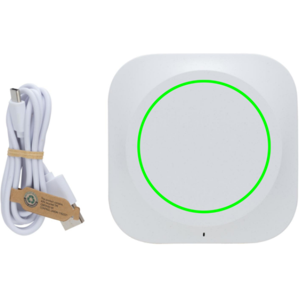 Elegant design 10W wireless charger made with FSC® 100% cork and RCS (Recycled Claim Standard) certified recycled ABS. Total recycled content: 33% based on total item weight. RCS certification ensures a completely certified supply chain of the recycled materials. Cork made from FSC 100% Cork. Wireless charging compatible with Android latest generations, iPhone 8 and up. Item and accessories PVC free. Including 120 cm type C charging cable made from RCS certified recycled TPE. Packed in FSC mix kraft box. Type-C Input 5V/2A; 9V/2A; Wireless output 5V/1A;9V/1.1A; (10W) Packed in FSC® mix kraft packaging. Item and accessories 100% PVC free.