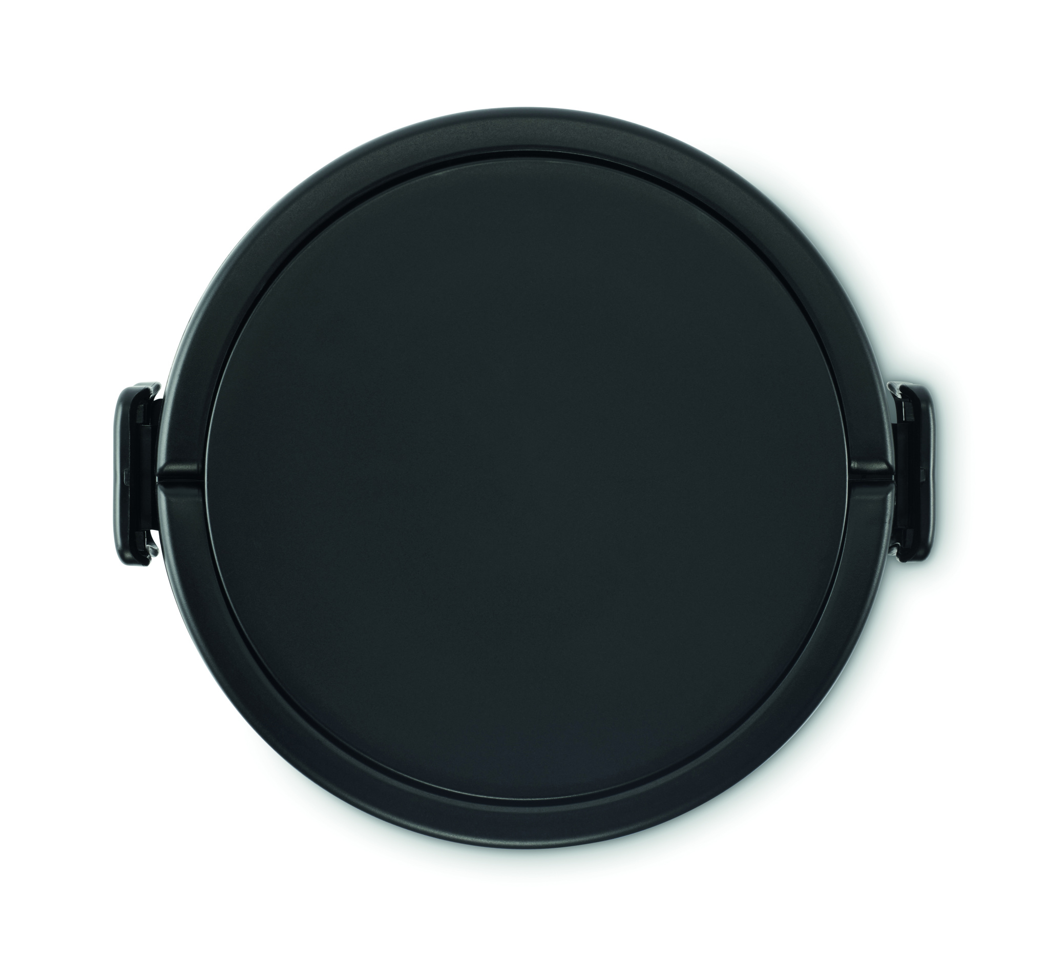 Two-tier round lunch box made of PP with side clip closure and handles. Includes inner lids in white. Capacity 250 ml top, 700 ml bottom.