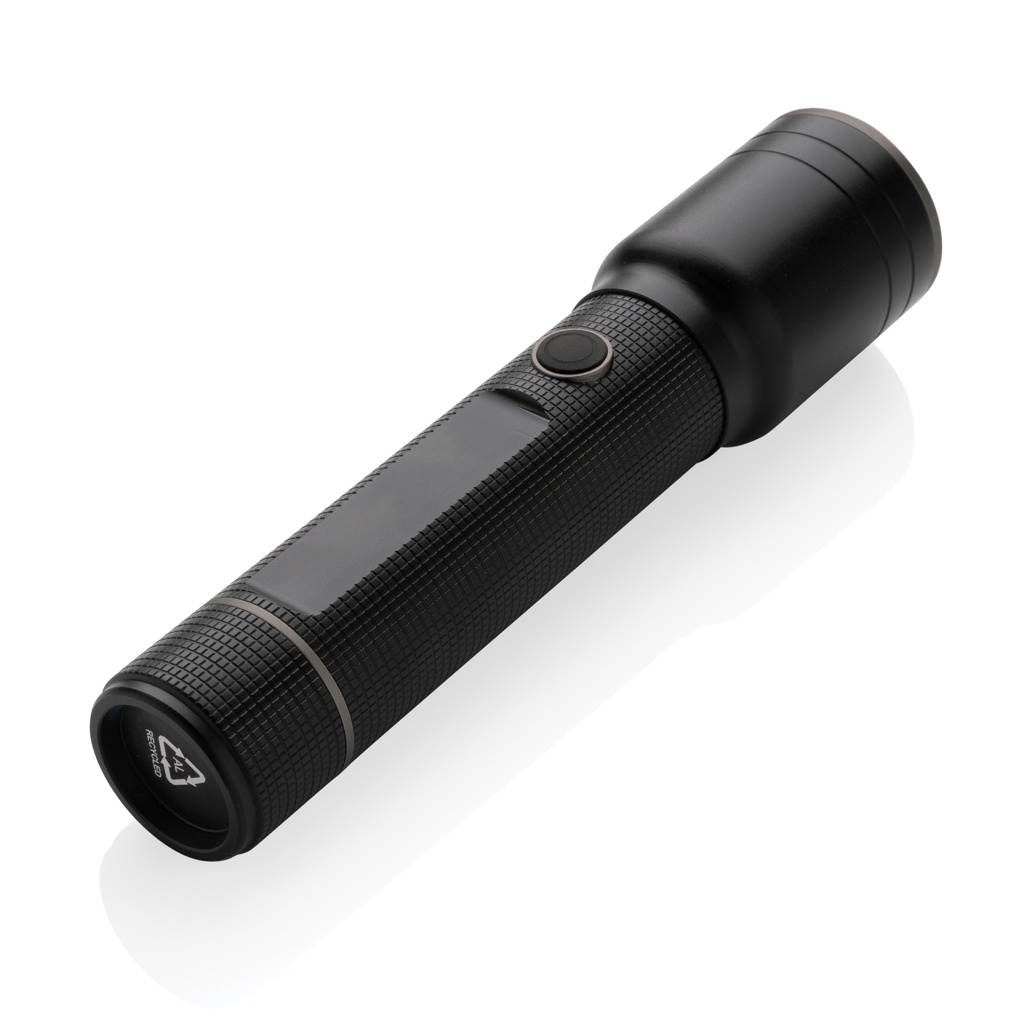 Functionality, performance and design all come together in this re-chargeable 10W torch made with RCS certified recycled aluminum. Total recycled content: 20% based on total item weight. RCS certification ensures a completely certified supply chain of the recycled materials. Because of its IP4 rating, it is weatherproof so can easily be taken outside. The powerful bulb creates up to 1500 lumen and a beam that reaches up to 800 metres. The torch uses a re-chargeable A-grade battery so no need to replace the batteries. Simply re-charge via your USB socket and the included RCS certified recycled type C cable. The high quality bulb comes with 5 modes including SOS function. The 4000 mah battery allows a usage up to 10 hours on a single charge and allows charging your mobile devices via type C. Aluminum does not lose its characteristics in the recycling process and can be recycled endlessly. Item and accessories 100% PVC free. Packed in FSC mix packaging. Input Type-C 5V, 1A; Output 5V, 1A