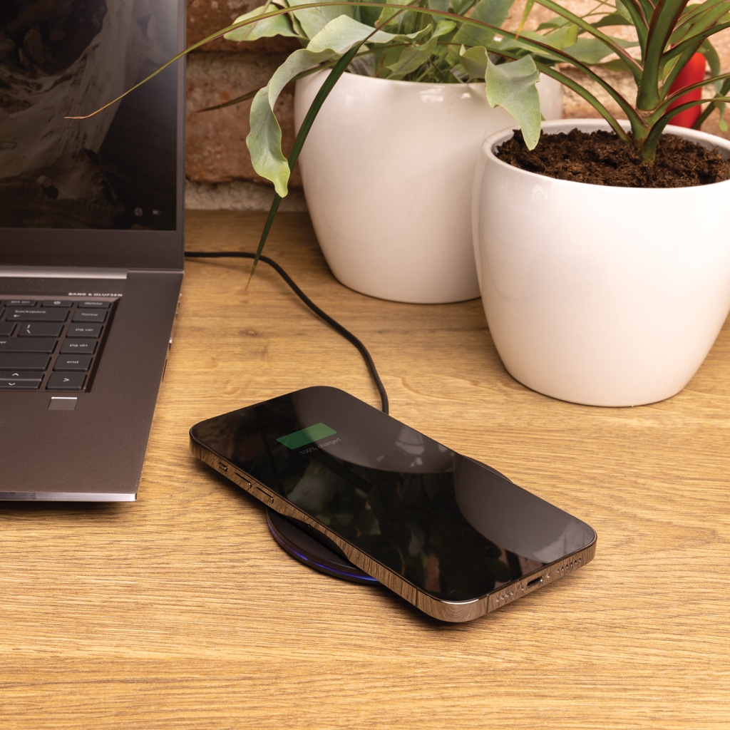 Ultra fast 15W wireless charger made with RCS (Recycled Claim Standard) certified recycled ABS. Total recycled content: 66% based on total item weight. RCS certification ensures a completely certified supply chain of the recycled materials. Wireless charging compatible with Android latest generations, iPhone 8 and up. Item and accessories PVC free. Including 120 cm type C charging cable made from RCS certified recycled TPE. Packed in FSC mix kraft box. Type-C in; Input 5V/2A; 9V/2A;12V/1.5A; Wireless output 5V/1A;9V/1.1A; 9V/1.67A(15W)