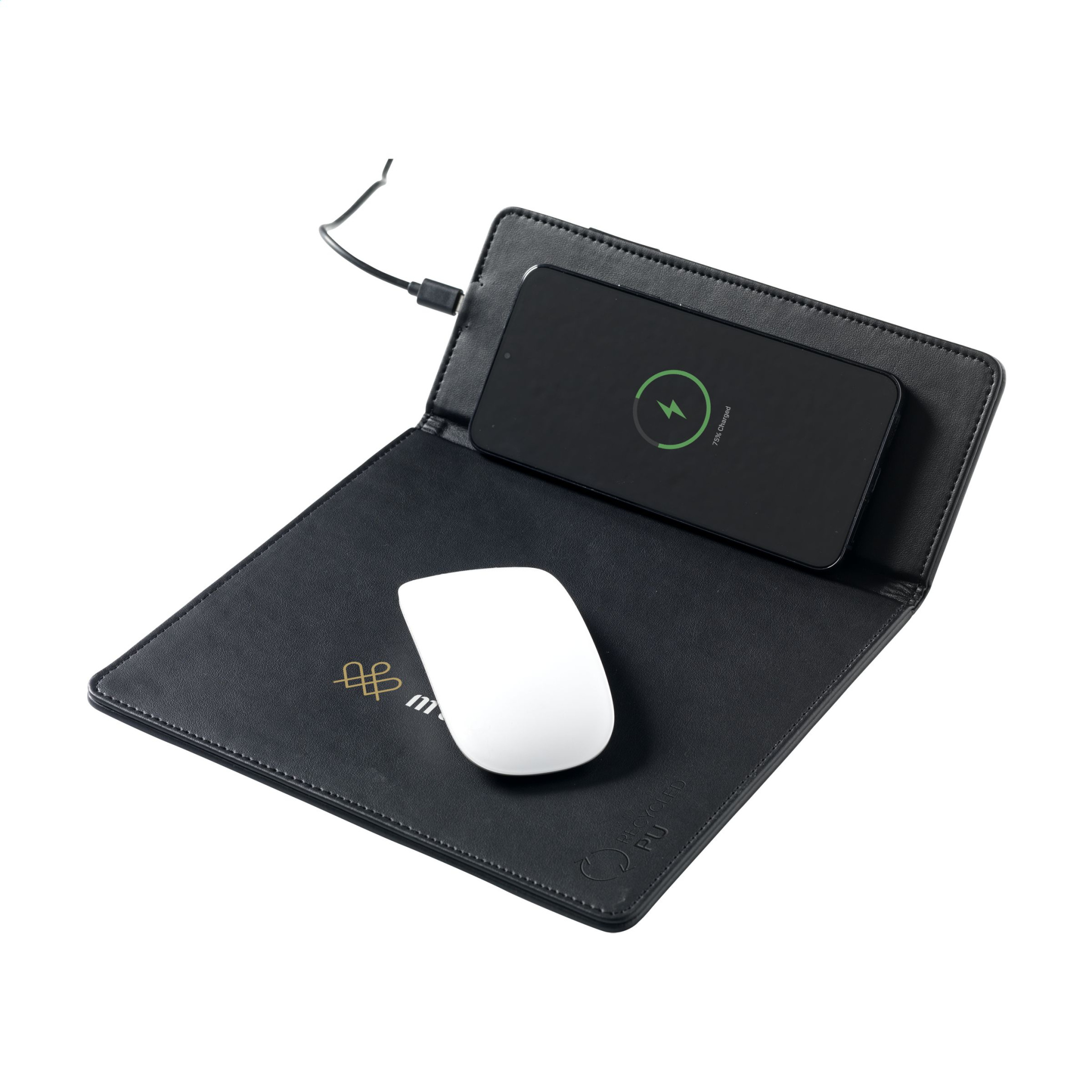 Multifunctional, wireless 10W charger mousepad. The exterior of this modern mousepad is made from recycled PU. You can efforlessly navigate your mouse and charge your smartphone on this cork mouse pad. Can also be used as a phone stand. Compatible with all mobile devices that support QI wireless charging (newest generations Android and iPhone). Includes USB-C charging cable. Input: DC5V-2.0A. Output: Type-C charging port. Wireless output 10W. RCS-certified. Total recycled material: 30%. Includes user manual. Each item is individually boxed.