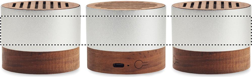 5.3 wireless speaker in recycled aluminium casing with walnut base and top detail. 1 Rechargeable Li-ION 300 mAh battery included. Output data: 3W, 3 Ohm and 5V. Playing time approx. 3h.