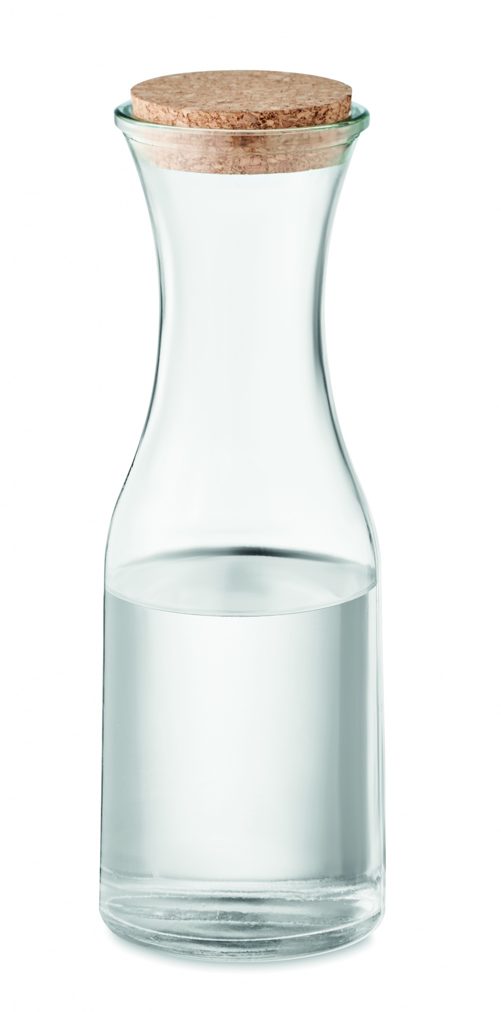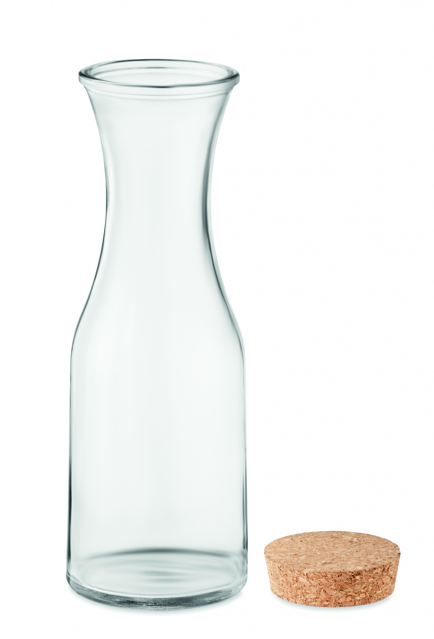 Recycled glass carafe with cork lid. Capacity: 1L. Cork is 100% natural material. Due to its structural nature and surface porosity the final print result per item may have deviations.