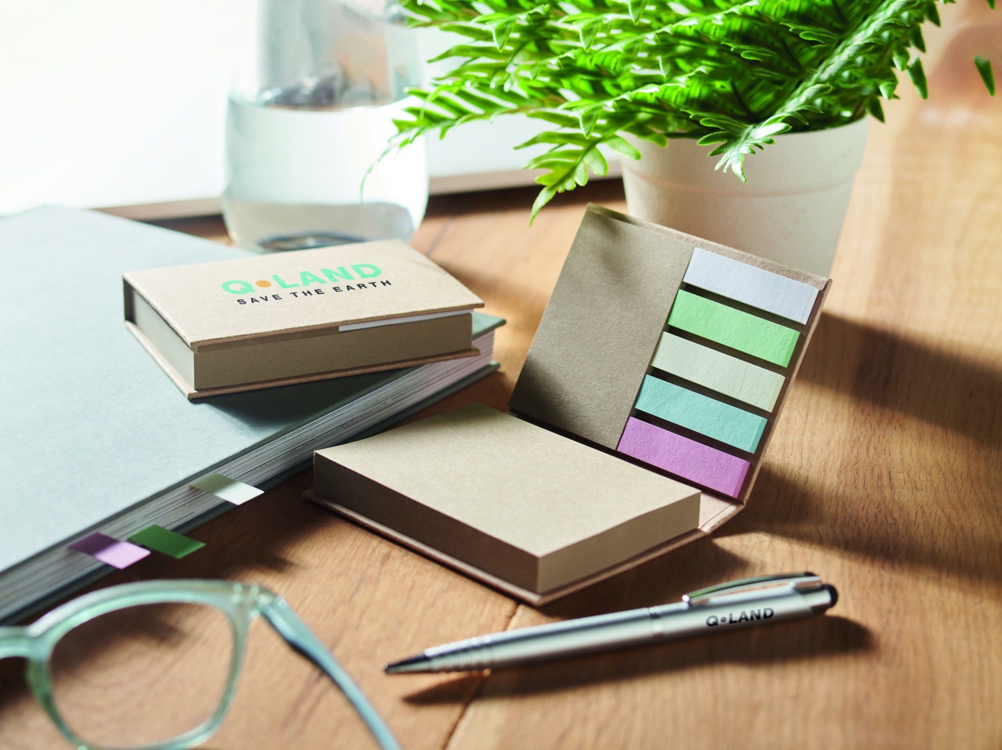 3-piece recycled paper sticky note memo pad. Large and medium sticky notes pads and 5 assorted colours page markers. Made in EU.