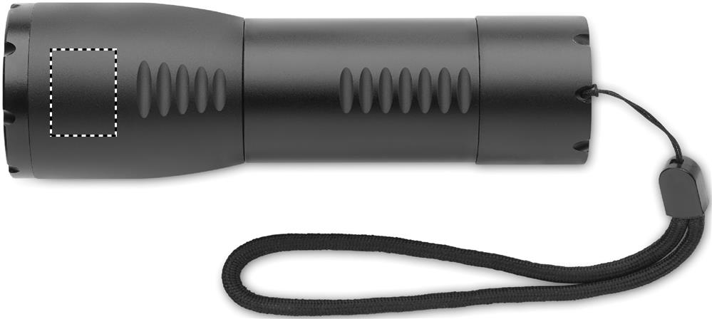 Small aluminium zoomable LED flashlight torch and detachable strap. Output: 200 lumen. 3 AA battery excluded.
