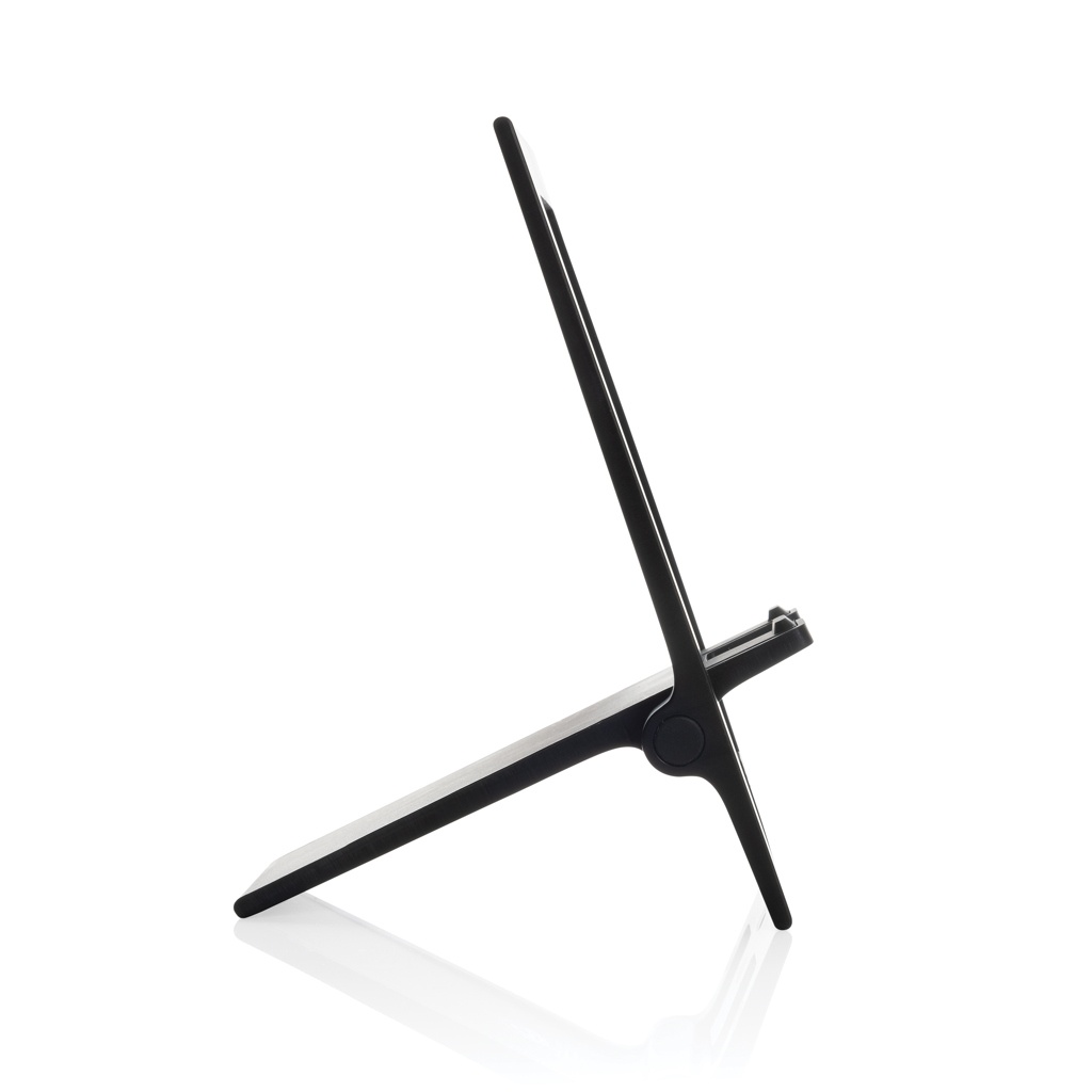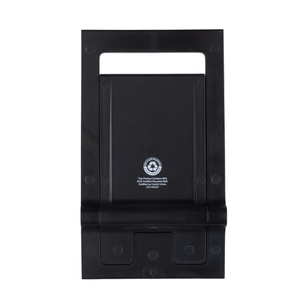 Flat and foldable phone stand made from RCS recycled ABS. The stand comes flat and folded and can be unfolded into a phone stand that can carry all size phones. The stand is strong enough to adjust the viewing angle. With silicon cushioning to keep your phone in optimal condition. Total recycled content: 85% based on total item weight. RCS certification ensures a completely certified supply chain of the recycled materials. Packed in FSC® packaging. PVC Free.